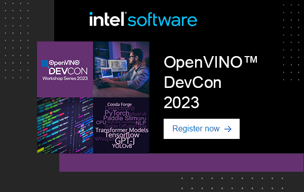 | | | | | Upcoming DevCon Webinars | | | OpenVINO™ 2023.0 – See What’s New | | 9AM-10AM PDT | | | | | | | How to Leverage OpenVINO’s Acceleration in Generative AI | | 7PM-8PM IST | | | | | | | Beyond the Continuum: The Importance of Quantization in Deep Learning | | 7PM-8PM IST | | | | | | | How To Build a Smart Queue Management System Step by Step? From Zero to Hero | | 7PM-8PM IST | | | | | | | | | |  | |  | © Intel Corporation. Intel, the Intel logo, and other Intel marks are trademarks of Intel Corporation or its subsidiaries. Other names and brands may be claimed as the property of others. |  | | | |