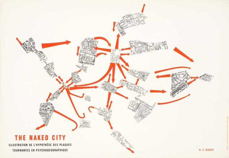 A shortish one for mid-month, cuz I’ve got a lot of stuff going on. I’m buried in a bunch of new explorations because I started listening to the Weird Studies podcast, run by a couple of guys who do very erudite riffs on philosophy of art (and music), popular culture, magical thinking, Zen, and a lot of fantastical stuff. They mentioned the Situationists and their maps in one ep. as a glancing aside, so I went digging, and as with every one of their references, it was a hairball of wonder! The map above is from Situationist Guy Debord’s work on psychogeography, investigating “specific effects of the geographical environment . . . on the emotions and behavior of individuals” (source). Debord and friends say (via a great article by Karen Rourke):