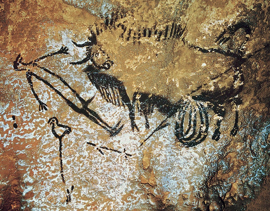 Yes, more prehistoric art before the post-historic AI! I was traveling in the Dordogne River valley this month and snagged a ticket to a replica model of the Lascaux caves. The famous Lascaux prehistoric paintings are estimated at 20K years old, and the original cave had to be shut due to traffic damage. (Btw, there are now three replicas — Lascaux II, which we saw, Lascaux III which travels, and Lascaux IV, a newer more digital experience; you need tickets for all of them, in advance. Yes, the replicas sell out.) The picture above of the little stick-figurey man is actually hidden in a deep shaft, not in the main galleries with the famous bulls, horses, deer, and other animals. There are a number of theories about this image, and here is one: