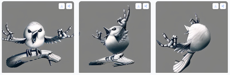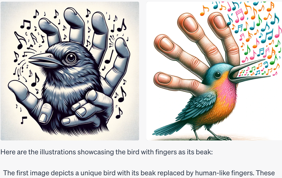 AI and Art Creativity NewsI guess the biggest news is the release of DALLE3 to GPT4 Pro users, which has meant a bunch of entertaining reverse engineering of what the chat model is injecting in terms of prompts and how you can interact with it. (E.g., Simon Willison’s Prompt Engineering DALLE-3.) From a creativity perspective, the output is less “pretty” than Midjourney’s defaults, but it can be steered more. Ish. HOWEVER. I feel gaslit pretty regularly. The GPT4 chat side doesn’t really know what’s in the image, especially in detailed debates over the content. It comes off like a patronizing sales person or my (former) terrible accountants, saying they’ve done a thing when they haven’t. It doesn’t truly understand, despite the improved training data with better captions as described in the Dalle-3 paper. (And a few days later, a similar look at better captions published by Google Research.) For instance, we went back and forth on illustrating “The bird sings with its fingers," after this initial good take: But when I asked for fingers in place of a beak, I got these and insistences that they both had beaks with fingers. I tracked down the original, in case you’re curious — hah, no birds. Of course. I’ve had other similar exchanges. I cannot, no matter what I do, get a picture of an asteroid impacting the side of a space ship. I keep trying to illustrate Aniara, the bleak Swedish SF movie I’ve written about before. Here’s the last pic and the little story it told me about an ENTIRELY DIFFERENT PICTURE after a lot of arguing: