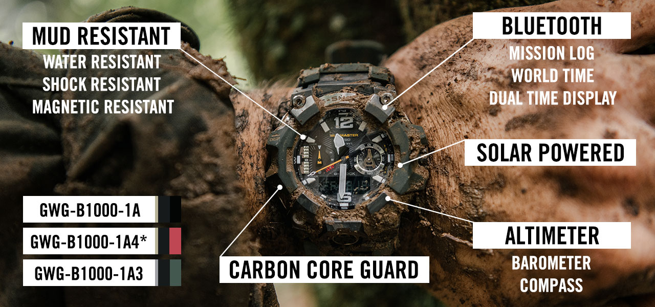 | | | | For those who demand nothing but the best | Unveiling the new MUDMASTER GWG-B1000, the ultimate adventure timepiece. With its rugged design, advanced sensors, Bluetooth connectivity, and mission-ready features, it's your ideal mission companion. Since its debut in 2015, the MUDMASTER range has stood as a testament to rugged reliability and unmatched performance, and the GWG-B1000 takes this legacy to new heights. Crafted to perfection and representing the pinnacle of the MASTER OF G series. Get ready to take on any mission... | | |