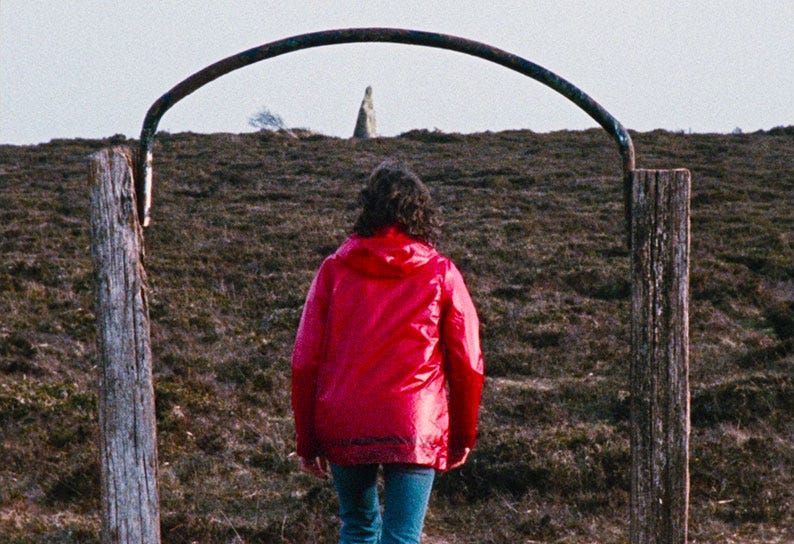 Two weeks ago I wrote about the magic radio poetry in Cocteau’s Orpheus, and here’s another weird film with a strange radio that’s very much worth a look: Enys Men by Mark Jenkin. “Enys Men” is Cornish for “stone island.” This film is a poetic visual experience, which hardly translates to a plot description. Jenkin, in interviews and on the British Film Institute site, cites Robert Bresson saying, “I’d rather people feel a film before understanding it.” As a ghost story, it makes fine fare for the mid-month esoteric & weird section I’ve added to the newsletter! A woman (“the volunteer”) is staying alone on a rocky island, every day visiting a small white flower growing on the cliff; she takes a temperature measurement and records in a notebook: “No change.” In a house lit by candles and powered by a small generator, she talks to someone on the radio occasionally. She tells them, “I’m not alone.” Does she mean the ghosts of history here, or her memories? because she is patently alone. We later realize the radio is not a straight-forward device, sometimes broadcasting odd voices and maybe from different times. We start to see glimpses of others: a young woman (herself? her daughter?), a fisherman’s face, some miners’ ghosts, women in old-fashioned dress. As a fateful May Day arrives, young girls in white dance and sing in front of the ruin of her former house. The island history we get in glimpses: an old mine that she superstitiously drops a rock in every day, a ruined factory, memorials for men lost at sea, a standing stone that she watches from her door and from which she watches her house. The woman finds things “out of time,” like a yellow fisherman’s slicker in the water, a white flower by the stone. A fisherman comes to deliver supplies—or does she remember him coming? Suddenly the flower changes: lichen grows on it. She finds lichen growing on a lurid scar on her own stomach. The standing stone moves. Various reviewers and Jenkin himself mention “stone tape theory,” the theory that objects or places can record and play back the past, a possible explanation for ghosts. The ghost story film “The Stone Tape,” which is the origin of this idea, is listed in his cinematic influences list on the BFI site. Certainly folding and wandering time is at the center of the woman’s experiences; Jenkin even plays film backwards in some clips, much like Cocteau did for his eerie effects in Orpheus. Jenkin says,