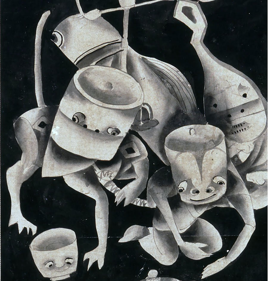 This is Noriko Reider’s “The Record of Tool Specters,” which walks us through a wonderful Japanese scroll about sentient tools taking revenge on their former owners. These tools are also called haunted relics, 99 gods, and artifact demons, among other names. Here are some of the discarded tools in the scroll, planning their next move: “Tsukumogami” are a subtype of Japanese magical entities called “yōkai” (here’s a visual site for them). Old household tools at 100 years of age can receive a soul and thus become sentient, and if they were mistreated or neglected may be tricky or malevolent haunts. This belief goes way back to the 1500s or earlier. In Shinto and (Shingon) Buddhism non-sentient beings also have “Buddha nature,” and may achieve enlightenment. So, tools too! The most popularly portrayed are tea cups and pots, buckets, umbrellas, sandals, musical instruments, lanterns, swords. They even take on human attributes, like arms or tongues or hair or eyes. The umbrellas, or kasa-obake, are particularly excellent, with one leg, one eye, and one long tongue: