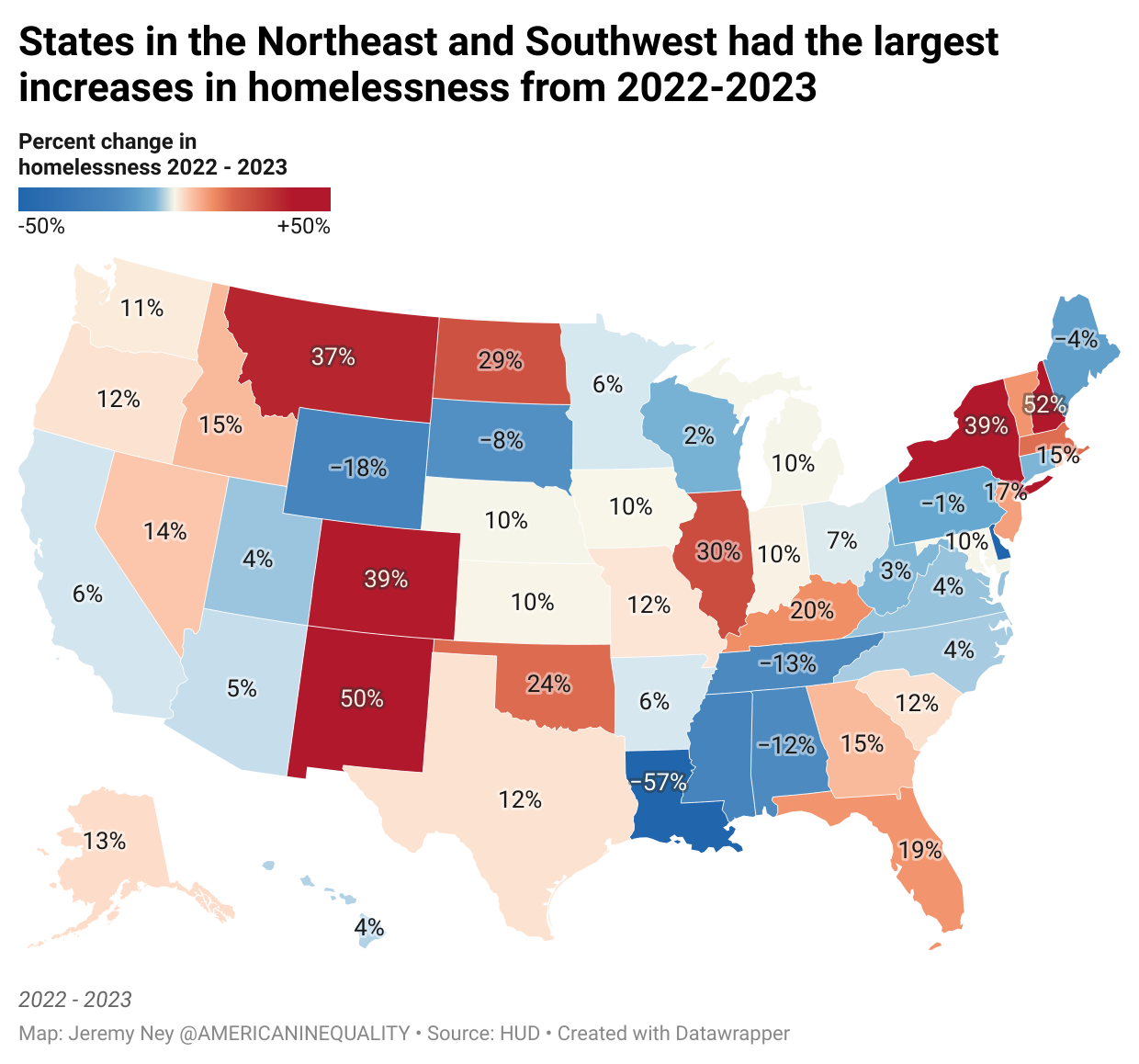 The combination of high rents and low inventory puts shelter out of reach for many Americans. When the new homelessness data came out, Jeff Olivet, executive director of the U.S. Interagency Council on Homelessness, a federal agency, said, “The most significant causes are the shortage of affordable homes and the high cost of housing that have left many Americans living paycheck to paycheck and one crisis away from homelessness.” New Hampshire and New Mexico both suffered from low inventory and high prices in 2023, causing their homeless populations to increase more than 50% in the past year. In New Hampshire, the housing vacancy rate has now fallen to below 1%, making it nearly impossible for families to move into new homes. New Hampshire Congresswoman Anne Kuster said her state lacks 90,000 housing units. Meanwhile, rents in New Mexico have grown 5x faster than incomes since 2017, creating tremendous barriers to finding affordable housing. In Albuquerque, the state’s largest city, only 20% of people in the city’s homeless shelters or temporary housing successfully make the leap into permanent housing each year, far below the national average. Cities not only need to create more housing, but also they need to create more affordable housing to help stem the tide. A few states have helped set the example for how this can be done. Expanded safety nets and targeted outreach provide much needed aidAt American Inequality, we’ve developed an approach called “Opportunity Mapping” which helps struggling regions learn from other areas that are best addressing key social issues. For homelessness, we’re highlight 4 states. Tennessee