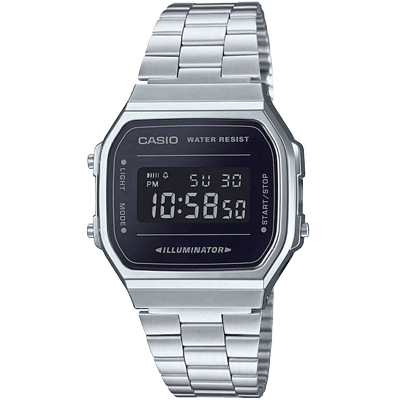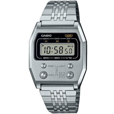 | Classic Casio Design | | | | | A part of the Vintage Retro Collection. This timepiece features a digital display, an Illuminator, daily alarm, and stopwatch. Resistant to minor splashing and has a black mirror face and shiny silver coloured bracelet. | | | | | | |