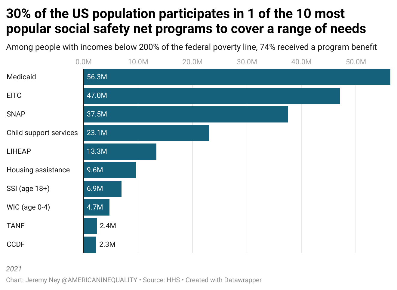 When it comes to tackling poverty, cash is kingThe 10 largest social safety net programs in the US cover the wide range of needs for Americans: healthcare through Medicaid; childcare support through the EITC and CTC; food benefits through SNAP (previously known as food stamps); and housing support through HCV and other voucher programs.