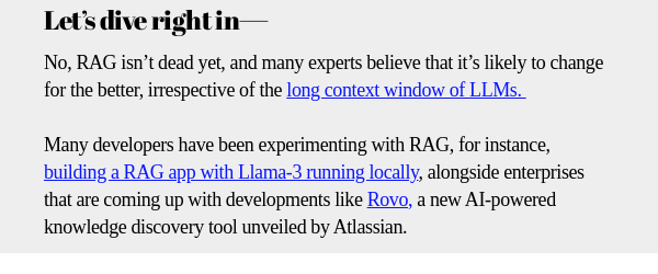 | | | | | As per reports, the LLM training cost for the top AI modelscontinues to surge. For instance, OpenAI’s GPT-4 is estimated to cost $78 million, while Google’s Gemini is estimated to have cost $191 million. So, if you choose to ditch RAGand instead stuff all your documents into the LLM’s context, the LLM will need to handle one million tokens for each query. For example, if you use Gemini 1.5 Pro, which costs approx $7 per million tokens, you will essentially be paying this amount every time the full million tokens are utilised in a query. The price difference is stark as the cost per call with RAG is a fraction of the $7 required for a single query in Gemini 1.5, especially for applications with frequent queries. Speaking of RAG, Subtl.ai, an Indian AI startup, has developed a ‘private Perplexity’ platform using light models tailored for enterprises, which operates on top of existing cloud infrastructure without internet connectivity to secure sensitive data. | | | | | | | | | | | The company told AIM that it started out using OpenAI solutions, moved to Mistral, and now uses Llama 3. It has five models under the hood for a seamless customer experience, with the second-biggest model being only 110 million parameters, making it lightweight and easy for customers to integrate. In the coming weeks, Subtl.ai plans to release the model for enterprise for free for a month and also give a private product on the internet for people to test out. | |