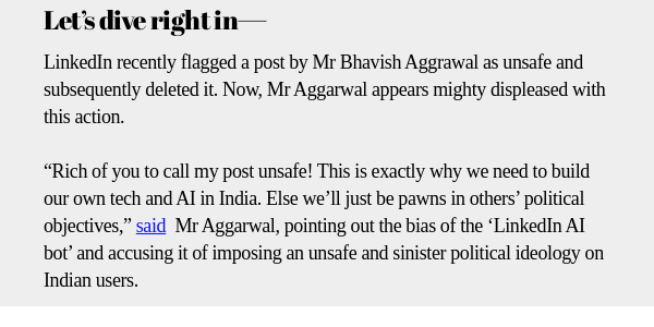 | | | | Hello everyone! Your friendly AI human, Amit Raja Naik, is back with this fresh edition of our brand-new newsletter. This time, we will talk about building ‘AI for Bharat’ instead of using ‘Bharat as an excuse to build AI’. | | | | | | | | | | | | More serious concerns for Ola Krutrim | | Recently, OpenAI announcedits plans to develop a new tool called Media Manager. The tool enables creators and content owners to specify how their work is used in machine learning research and training AI models. It is designed to respect these choices and is expected to be released by 2025. The catch is that this new tool will be of great help to OpenAI in collecting Indic data and building GPT models. However, it could also hurt many Indian AI startups, including Ola Krutrim, SML Hanooman, and others, which are still struggling to onboard new users onto their platforms. That also explains why OpenAI recently hired Pragya Misra,its first employee in India, as the government relations head to lobby the Indian government and create a safe space for OpenAI to operate in the country. | |