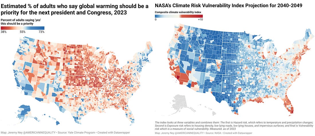 54% of adults say ‘Yes’ global warming should be a priority for the next president and Congress. In fact, the majority of people in every country in the world worry about climate change and support policies to tackle it. However, those global and national numbers mask the reality of what is happening on the ground in America. When looking at a county level, I found that the people who are most at risk of devastation from climate change tend to live in Democratic areas. These people generally believe that global warming should be a priority, but many of their more rural or suburban neighbors disagree. For those who disagree, this may be because these communities have concerns that feel more imminent, like housing affordability, food insecurity, and inaccessible healthcare. However, natural disasters ravage these communities at an increasingly destructive and frequent rate each year. Climate Opinions vs. Climate RiskClimate change can be a significant driver of inequality. Natural disasters can also decrease household incomes by 21.5% for years afterwards and they can also create “brain drains,” making it harder for regions to grow and attract or retain highly-educated civilians, like doctors, or scientists. Low-income families cannot afford to endure natural disasters because it takes them 2x - 3x longer to financially recover from natural disasters. Alameda County, California has the largest gap between climate risk and how important residents think the issue is. NASA says the region only scores a 2 on the scale (the highest county is 22) whereas 73% of residents think that this should be a priority. Alameda is where Oakland is, right across the Bay from San Francisco. Meanwhile, Los Angeles and Miami are the two counties with the greatest risk (scores of 22 and 16 respectively), but only 60% of residents there think that climate change should be a priority. As we’ve previously discussed in American Inequality, both the number and the magnitude of natural disasters has been increasing in America over the last decade. Floods, wildfires, tornadoes, and earthquakes are causing billions of dollars of damage as these events grow in size and occur more often. Miami-Dade has experienced two natural disasters per year for the last 20 years, a huge number in historical terms and much higher than any other region. The number of natural disasters that cost over a billion dollars in damage has increased more than 4x over the last 40 years. Calhoun County in West Virginia has the lowest percent of residents that think climate change should be a priority for the next president or Congress. 75 miles northwest of the state’s capitol, Calhoun had flooding and mudslides in August 2023 that FEMA declared a natural disaster and that President Biden issued federal funds for support. Nonprofits say that 1 in 4 homes in the region is also at high risk of destruction from climate change.