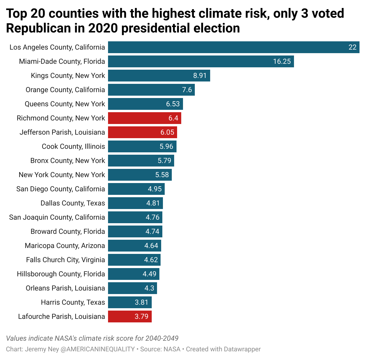 Democrats are four times more likely to say that climate change is impacting their community ‘a great deal’ and this generally holds true in the data on areas that are most at risk. While the Gulf Coast area with Louisiana and Alabama has experienced more hurricanes each year, many of America’s liberal strongholds like New York City and Los Angeles have the greatest climate risks based on the NASA data. Floods and wildfires in these cities kill dozens each year. Only 3 of the top 20 counties with the great climate risk voted Republican in the 2020 presidential election.