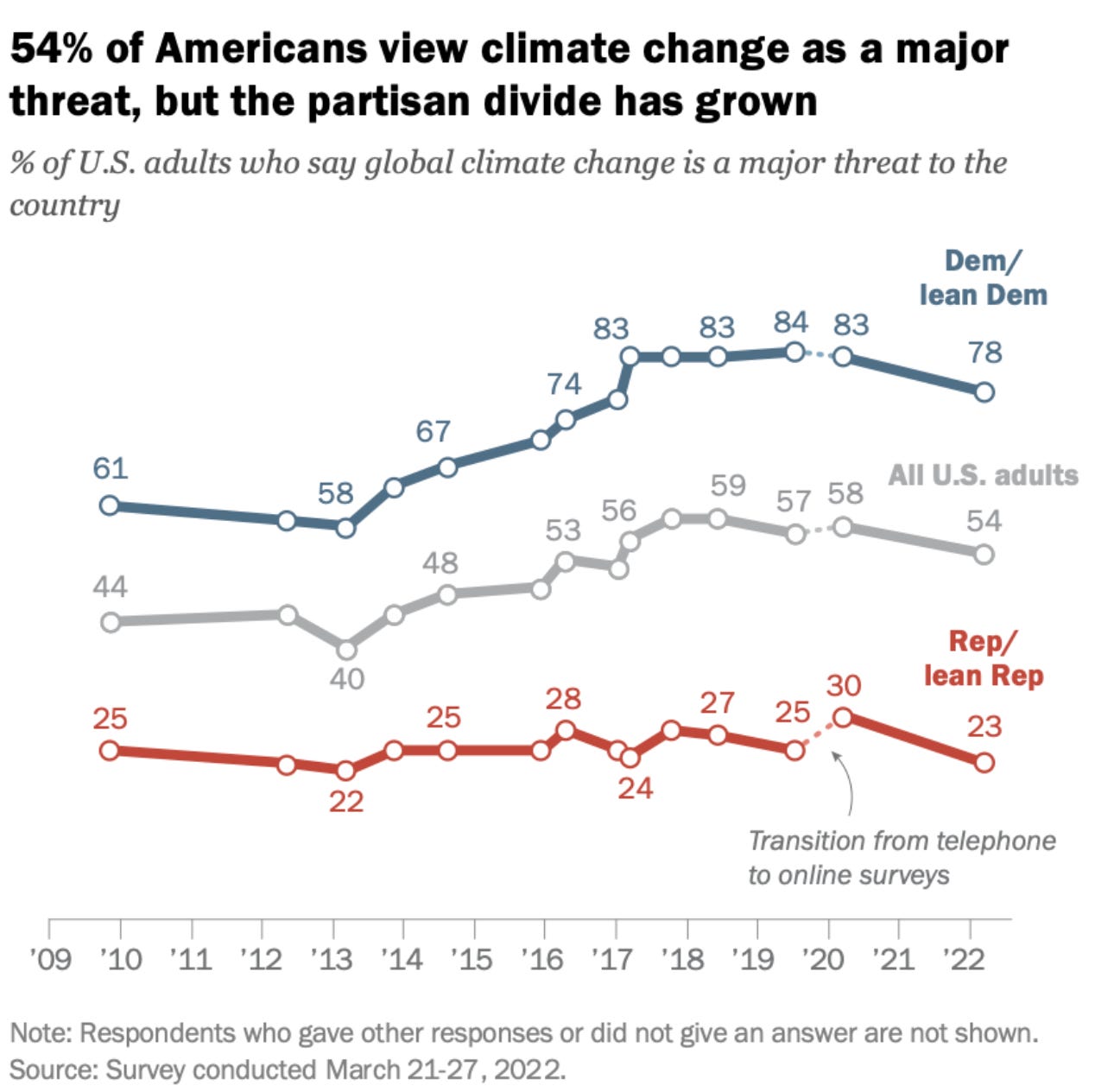Why Don’t More Americans Care About Climate Change?The 10 warmest years in the 174-year record of keeping climate temperatures have all occurred during the last decade (2014–2023), but alas other issues take the spotlight. Views on climate change tend to fall along a partisan divide. While 78% of Democrats say that climate change is a major threat, only 23% of Republicans say the same.