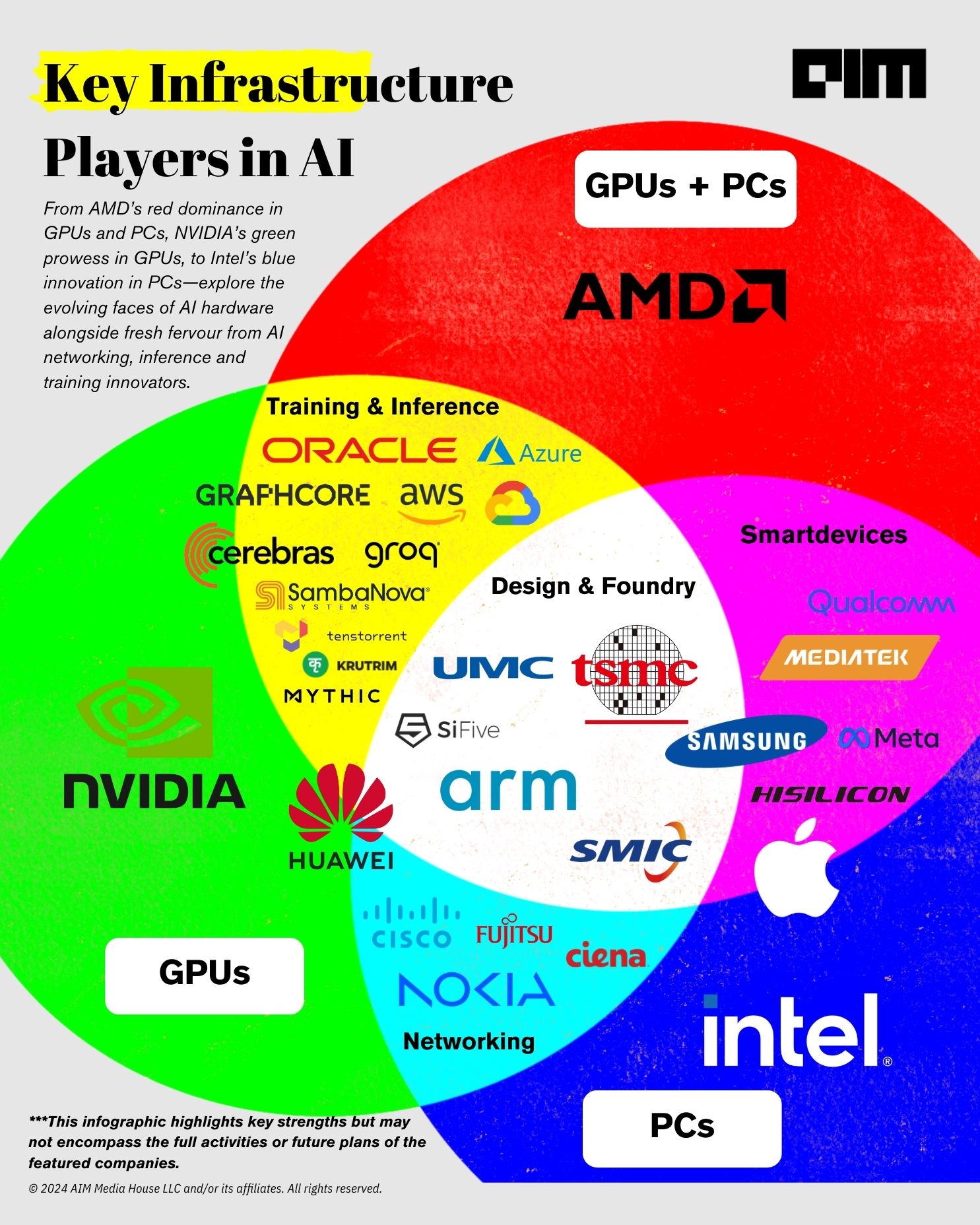 The infographic shows emerging trends in the AI hardware sector. At the forefront, companies like AMD, NVIDIA, and Intel (shown in vibrant RGB colours) continue to drive advancements in GPUs and PCs. They are supported by foundational design and foundry firms such as TSMC, SMIC, UMC, Arm, and SiFive (illustrated in white), whose expertise in chip manufacturing underpins the latest AI innovations.