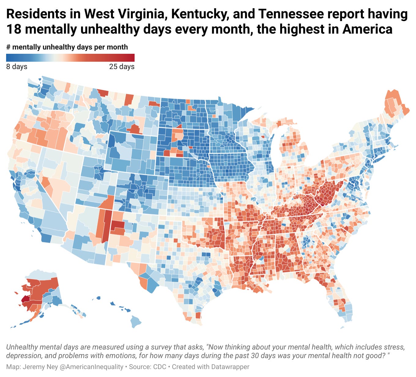 Two datasets are instrumental in figuring out where policymakers, health advocates, and community organizations can focus their efforts to help Americans most in need. First, the CDC surveys Americans annually about their mental health (“Now thinking about your mental health, which includes stress, depression, and problems with emotions, for how many days in the past 30 days was your mental health not good?”) and second, the Center for Medicaid and Medicare Services keeps identifier records on the number of mental health providers in each county. This data helps us understand which regions in the US have the greatest strife as well as the least support. Kentucky, Tennessee, and West Virginia have the highest rates of mental health challenges. Residents in these 3 states report on having 18+ mentally unhealthy days per month on average.