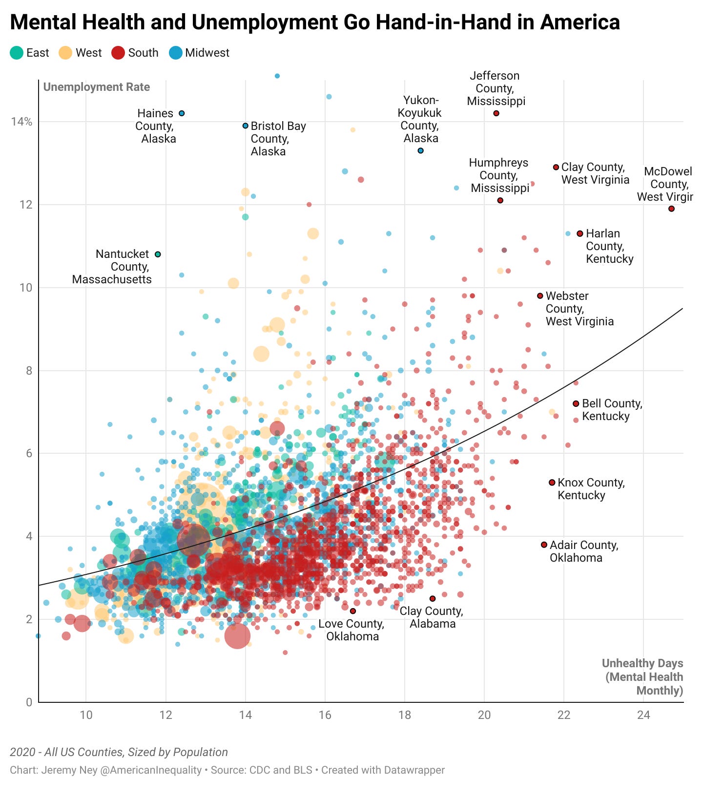 Residents in Massachusetts, on the other hand, report having the lowest number of mentally unhealthy days on a population weighted basis at 12.1 days. Massachusetts also has the best ratio of mental health providers to its overall population - There is at least 1 psychiatrist, psychologist, licensed clinical social workers, counselor, or specialized nurse practitioner for every 159 residents. Mental health is deeply connected to unemployment, opioidsThe chart above highlights the increasingly strong relationship between mental health and unemployment. The correlation between unemployment and mental health is highest when we look at southern counties alone. At the top of the chart, Jefferson County, Mississippi has an unemployment rate of 14%, while residents here report 21 mentally unhealthy days per month. CDC research shows that odds of depression are 3 times higher for unemployed than employed adults. Mental health and unemployment can also create a vicious cycle where those struggling with mental health may find it more difficult to get jobs due to stigma or lack of awareness, while a lack of a job may contribute to exacerbating mental health challenges like anxiety or depression. The Boca Health Center provides key insights on how mental health challenges are interwoven with other issues like drug addiction. Depression and addiction commonly co-occur, and each condition can complicate the other. They show that 40% of people with depression also struggle with addiction. Without mental health support, many are thrown in jailMcDowell, like many counties in America, has no resources for support. McDowell is one of 50 counties in America where every 10,000 residents has access to just 1 mental health provider. The Substance Abuse and Mental Health Services Administration (SAMSA) estimates that the US has a shortfall of 58,000 psychologists; 49,000 social workers; 27,000 mental health counselors, and 15,000 psychiatrists, not to mention the 78,000 school counselors that America needs. Overall, 115 million people in the United States live in an area that is designated as a Mental Health Professional Shortage Area (HPSA), according to the Department of Health and Human Services. A region is deemed an HPSA if the ratio to mental health professional to residents is smaller than 1 per 30,000 people. A mental health provider, by the definition above, is a psychiatrist, psychologist, licensed clinical social workers, counselor, marriage or family therapist, or mental health provider that treats alcohol and other drug abuse, as well as advanced practice nurses specializing in mental health care. Dr. Kathy Pike, Professor of Psychology at Columbia University and CEO of One Mind , shared with us, “Even in the best served communities, there are not enough providers anywhere. The real issue is that there is more need everywhere.” Despite this tremendous gap, the healthcare system overall has ways of adapting. Family medicine, internal medicine, psychiatry, neurology, and pediatrics have increasingly trained doctors to provide regular care for patients with mental health disorders. Just because a region lacks a psychiatrist or psychologist does not mean that it is completely without care. Still, 84 million Americans live in areas deemed primary care HPSAs. Major cities tend to have the most providers. Los Angeles’s county has 34,521 mental health providers (with a ratio of 1 to 293 residents), Chicago’s county has 14,046 (with a ratio of 1 to 396) and Manhattan’s county has 13,986 providers (with a ratio of 1 to 116 residents).