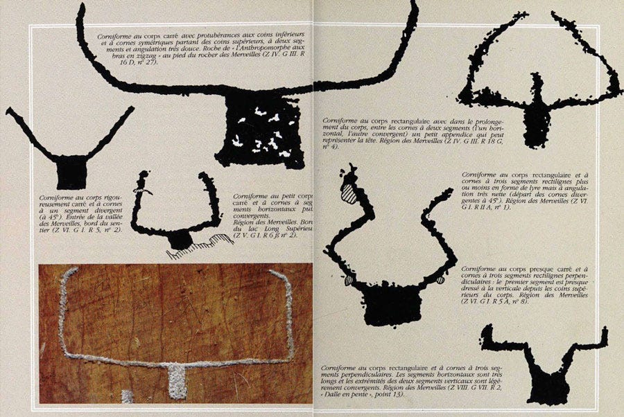 It’s hard to see the zig zag, but the foremost writer about these, Henry de Lumley (that links to Int Archive copy), suggests the zig zagger has the head of a sun, and arms that depict rain or storms falling on fields. So, a goddess, perhaps. Most of the figures are male, even the “danseuse” The largest number of the icons are “corniforms,” or horned heads, thought to be bulls. I mean, maybe they are demons? or angels? Or people with their arms up? Sure, bulls. Here’s a Lumley page on their many forms: