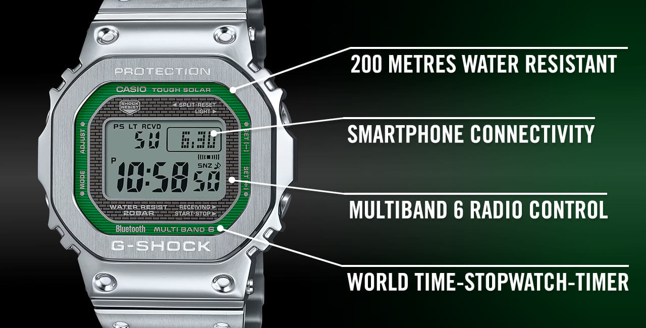 | | A Legacy, Redefined | | Merging iconic G-SHOCK design with a sleek full-metal build, the GMW-B5000D-3ER offers Bluetooth connectivity, Tough Solar power, and Multiband 6 precision. | | | |
