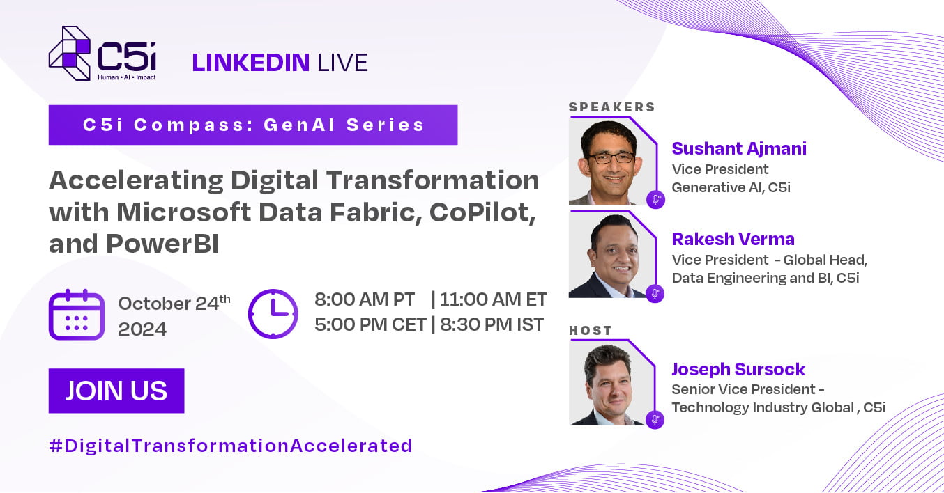 | | | | Hi All, We are thrilled to invite you to C5i’s upcoming LinkedIn Live session from the C5i Compass – GenAI Series on "Accelerating Digital Transformation with Microsoft Data Fabric, CoPilot, and PowerBI." Join this insightful session moderated by Joseph Sursock, SVP - Technology Industry Global, C5i, featuring industry experts Rakesh Verma, VP - Global Head Data Engineering and BI, C5i and Sushant Ajmani, VP - Generative AI, C5i. The session will offer actionable insights on integrating Microsoft Data Fabric, CoPilot, and PowerBI to streamline AI-driven decision-making and enhance data governance. Explore real-world solutions for seamless integration and discover how these tools unlock powerful insights to boost your business efficiency. Why Attend? Gain insights on streamlining data governance with AI-driven tools Learn real-world examples of Microsoft Data Fabric, CoPilot, and PowerBI in action Discover how to unlock actionable insights and boost efficiency across your business | | | | | | | | | | | | | | | About C5i C5i is a pure-play AI & Analytics provider that combines the power of human perspective with AI technology to deliver trustworthy intelligence. The company drives value through a comprehensive solution set, integrating multifunctional teams that have technical and business domain expertise with a robust suite of products, solutions, and accelerators tailored for various horizontal and industry-specific use cases. At the core, C5i’s focus is to deliver business impact at speed and scale by driving adoption of AI-assisted decision-making. C5i caters to some of the world’s largest enterprises, including many Fortune 500 companies. The company’s clients span Technology, Media, and Telecom (TMT), Pharma & Lifesciences, CPG, Retail, Banking, and other sectors. C5i has been recognized by leading industry analysts like Gartner and Forrester for its Analytics and AI capabilities and proprietary AI-based platforms. | | | | |