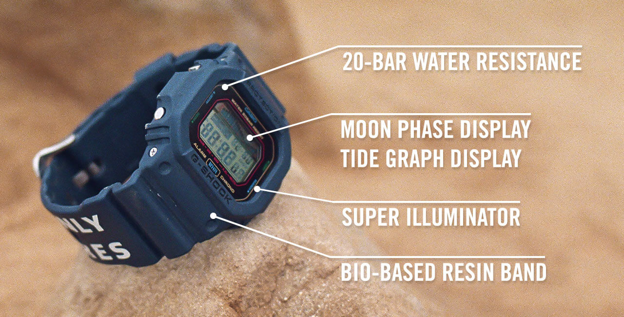| LIMITED EDITION: G-SHOCK x WHR WATCH & APPAREL | | The GLX-5600WHR24 is the ultimate companion for surfers and ocean enthusiasts, blending practical features like a tide graph and moon data with eco-conscious bio-based materials. Each watch comes in sustainable packaging and includes a surfboard sticker for added flair. Don't miss this sleek, limited-edition design crafted to connect you with nature. | | |