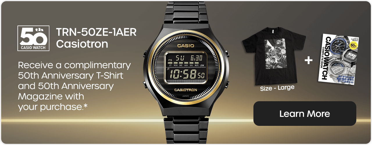 | | | For a limited time, receive a 50th Anniversary T-Shirt and an exclusive Casio 50th Anniversary Magazine automatically at checkout with every TRN-50ZE purchase. Gifts are available while stocks last and will appear in your cart when eligible. Subject to availability.