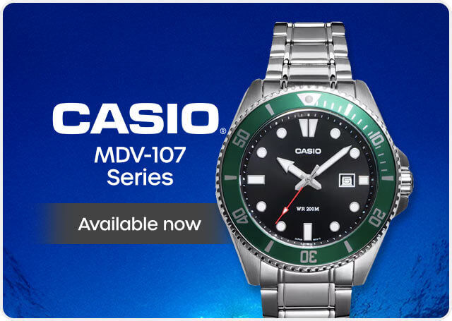 | | Casio Diver Watch Collection | | Dive into style and functionality with the MDV series. Featuring 200-metre water resistance, a unidirectional rotating bezel, and a screw-lock case back, it's built for ocean sports and marine adventures. Choose between a sleek steel band or an eco-friendly bio-resin strap for the perfect fit. | | | |