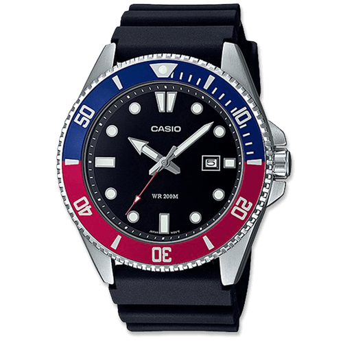 | | MDV-107-1A3VEF | | This timepiece stands out with its black dial, enhanced by bold blue and red highlights. | | | | | | | |