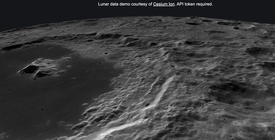 Gathering Moon ThingsHappy Lunar New Year! And now some moon-y things that have opened my tabs in the past month. An interactive explorable about the moon by Bartosz Ciechanowski (shared by many link collectors, I may have seen it first in Matt Muir’s Web Curios). It is long, detailed, deep. Let’s hear it for educational passion projects. Lidar scans of the moon: Explore an Incredibly Detailed Topographical Map of the Moon (via kottke and others). Their visualization show the actual imagery, in a zoomable and crater-filterable view. With a mouse, you can also rotate the view as I did here: After seeing that, I spent a little while trying to see how to view this data in three.js for a web app. Welp, today I found this via happenstance (cuz searching did not help me). Someone at NASA already did it, with an amazing toolkit of three.js for 3D tiles (see more below in my Misc Web section): Then a nice essay by Andrew Liptak whose SF newsletter (Transfer Orbit) I support: Destination: Luna, or “How scientists and science fiction writers discovered the Moon.” Let’s hear it for the French creatives!