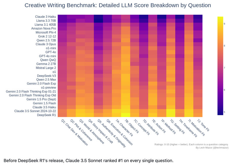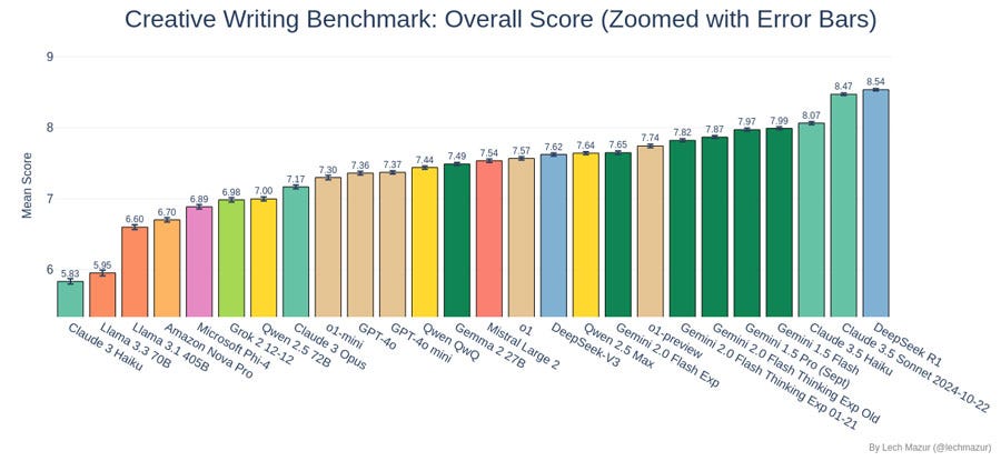 FYI, this reminded me of a Frank Lantz piece, “Are Games Bad?” that critiques Hideo Kojima’s writing. Narrative Research & Genlechmazur/writing: This benchmark tests how well LLMs incorporate a set of 10 mandatory story elements (characters, objects, core concepts, attributes, motivations, etc.) in a short creative story (h/t Jeremy Howard). Judging (by LLM agents) based on:
