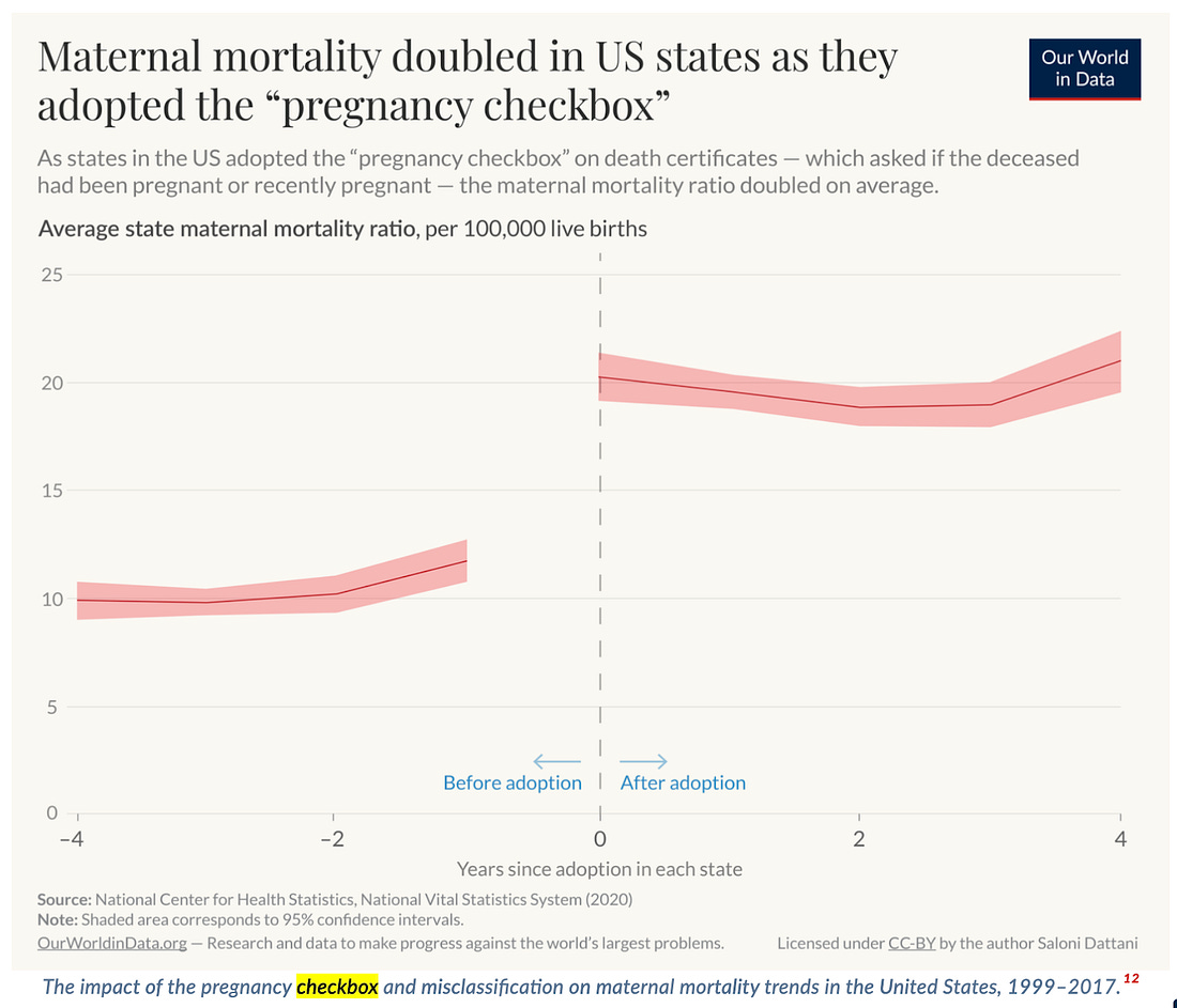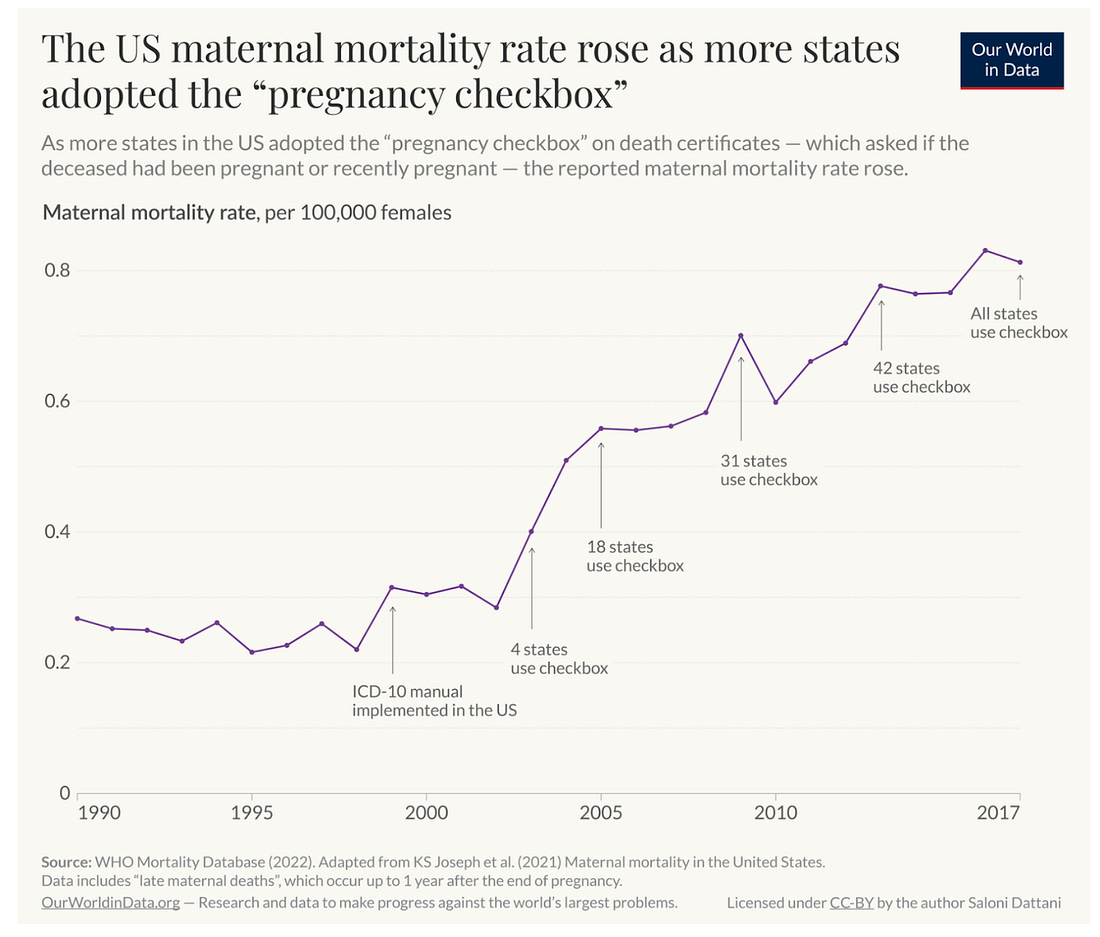 To understand why this data is so flawed, it's important to understand what the maternal mortality numbers represent, how those numbers are captured, and where public health officials decide what is included and excluded in these figures. The CDC botched the rollout of maternal mortalityThe CDC categorizes maternal death as a (a) death while a woman is in the hospital about to deliver; (b) a death while giving birth; or (c) a death 42 days or 6 weeks after birth. But only recently did the US begin systematically tracking this data. In 1999, the CDC added a new checkbox on death certificates to begin tracking maternal mortality. The agency put the burden on the states to identify whether one of the 3 conditions above were met. States were then responsible for reporting that number to the central federal agency. However, the rollout of the new maternal mortality checkbox was a disaster. Doctors weren’t properly trained on whether the pregnancy was the cause of death and states were allowed to adopt the checkbox on their own timeframes. If a woman dies in a car accident within 6 weeks after giving birth, is that a maternal mortality? What if she is pregnant and has a heart attack? On top of states having their own timelines, many of them also used different language on the death certificate questionnaires to understand if the death was related to the pregnancy or incidental. For example, a doctor in one state might see: "Was the decedent pregnant at the time of death?" (Yes/No/Unknown) While another doctor in a neighboring state would see: "Was the decedent pregnant or recently pregnant (within 42 days of death)?" Whereas a third doctor might see: "Was the death pregnancy-related?" Any time a state added the checkbox, the state maternal mortality rate suddenly doubled.This wasn’t necessarily because more women were dying from pregnancy, it was because the state finally decided to systematically ask the question. Estimates of maternal death rates began to rise in 2003 when a pregnancy checkbox first appeared on U.S. death certificates. However, the CDC acknowledged that the governance around this data and the usage of that checkbox was faulty. 4 states had adopted it in 2003 and 18 had adopted it by 2007. The data flowing in was not even handed and it was still missing results from 32 other states. Because of this data quality issue, the CDC stopped reporting the maternal mortality data for a full decade between 2007 and 2017. By 2017 every state had adopted the approach. The CDC then spent huge resources training doctors, aligning the language on death certificates, and making sure that states were reporting in line with each other. In 2018, the agency acknowledged that it was likely still overcounting the data, but that things were on a much better track. Is the new data correct? UnlikelyWhy did the CDC say that it was overcounting the data and not undercounting it? What led them to this belief? A team of researchers took up this question and published their results in The American Journal of Obstetrics and Gynecology. Rather than strictly relying on the checkbox and whether the woman was pregnant, these researchers used computer learning models to read the causes of death on the death certificate. “If you’re pregnant and die in a car crash, that’s not a maternal death,” Cande Ananth said, one of the lead researchers on the groundbreaking report that shook the medical world. “A big change driving recent increases in the official numbers stems from the tendency to include more and more cancers unrelated to pregnancy in maternal death rates. A woman who had a diagnosis of breast cancer before conception and then died after the pregnancy ended or – a woman who would have died if she’d never gotten pregnant – will be counted as a maternal death.” Ananth and K.S. Joseph, the other lead researcher, found that the maternal mortality rate in America is actually 10.4 per every 100,000 births, half of what the CDC’s official estimate says. This would put America much more in line with other wealthy nations like Canada, the UK, and France. Ananth’s team also showed that maternal mortality has remained relatively flat since 2002. The CDC’s estimates on the other hand showed that maternal mortality rates had spiked to 34 deaths per 100,000 births in February 2022. This huge flux doesn’t show up in the new data. Ananth’s data showed that the CDC was including more deaths as ‘maternal’ deaths than should be. Going beyond a simple box and using the text of what doctors used helped clear up the picture and show that the US was much better off for maternal mortality deaths. However, Ananth’s team overlooked the single biggest cause of maternal mortality in America: homicides. Once we include this data into the picture, the rates tick back up again. This is what part 2 of this series will be about. ... Continue reading this post for free in the Substack app |