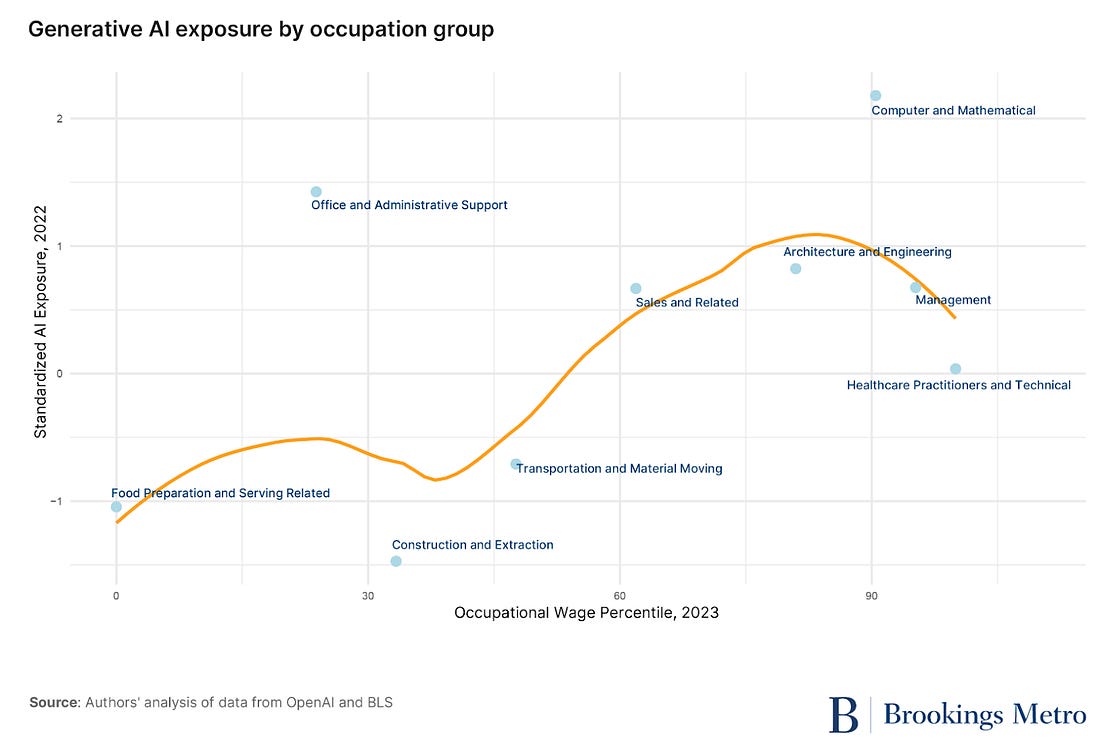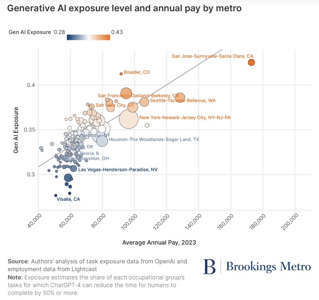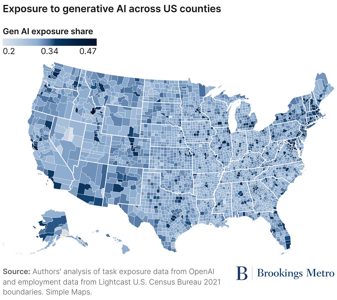Is ChatGPT going to increase inequality?Generative AI is coming for high-wage jobs concentrated in certain parts of the USListen to this article as a Podcast and make sure to join the newsletter. Send to a friend and Substack will automatically upgrade you with free perks.There’s an incredible amount of hype about whether AI is coming for your job. There’s an interesting new report that helps break this question down further: which type of AI might take which type of job, and where might it actually happen? The report specifically looks at generative AI - tools like ChatGPT, Gemini, Claude - and looks at all jobs within the US. The researchers then break this down by counties that have the highest concentrations of those jobs which are at the highest risk. The results are fascinating and surprising. The focus on generative AI vs. AI uses in robotics drives a helpful distinction in this work. The AI used in robotics is most likely to displace low-wage workers (warehouse jobs, manufacturing, food services, etc). Research from Nobel Prize winning economist Daron Acemologu at MIT found that for every robot added per 1,000 workers in the US, wages decline by 0.42%, and the unemployment-to-population ratio goes up by 0.2 percentage points. The team found that the results were most pronounced for low-wage workers. “Robots are most likely to affect routine manual occupations and lower and middle class workers, and particularly blue-collar workers, including machinists, assemblers, material handlers, and welders.” The automotive industry has adopted robots more than any other industry, the researchers write, employing 38% of existing robots with adoption of up to 7.5 robots per thousand workers. But, generative AI is a different story. This technology is most likely to displace high-wage and highly technical jobs. There are a few places and industries in particular which are at highest risk. What do we know about the impact of generative AI on the workforce?On a recent episode of the Tonight Show with Jimmy Fallon, Bill Gates said that AI will replace doctors and teachers within 10 years and claimed humans won’t be needed ‘for most things’. I prefer to focus a bit more on some massive datasets to tell us what might really happen. Two new datasets helps explain which jobs and which parts of the US are most at risk from the recent explosion in AI capabilities. The first comes from OpenAI itself, which published “exposure data” (downloadable here) that looks at occupations most at risk of disruption from generative AI and Large Language Models (LLMs). The second comes from Brookings and Lightcast which looks at which parts of the country are most concentrated in those occupations. The team also makes sure to focus on the distinction that “exposure” is not the same as “displacement.” Mark Muro, the lead researcher, writes, “And it should be said, again, that “exposure” does not speak only to the displacement of workers; it also may involve their “augmentation” through rapidly improving AI tools such as ChatGPT, Claude, and generative AI-powered applications, which can enhance worker productivity and capability.”