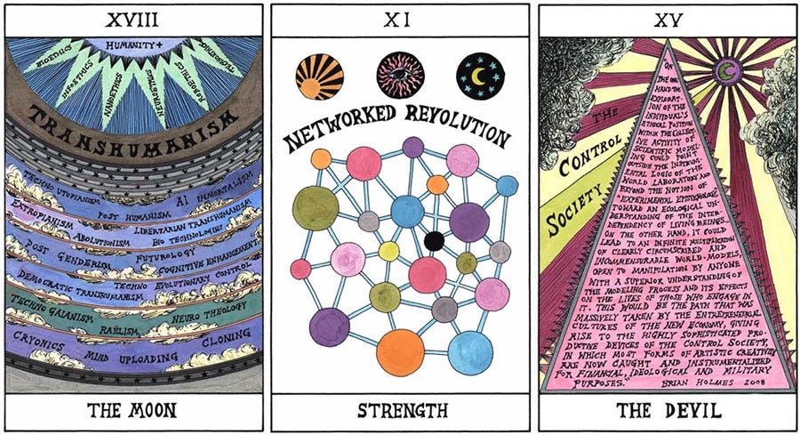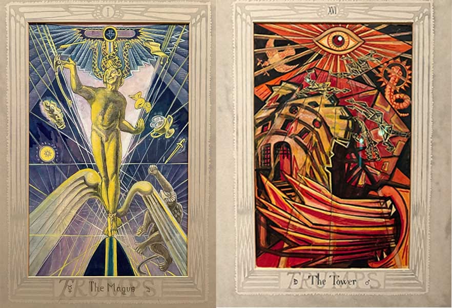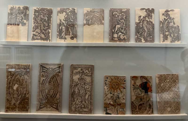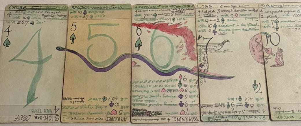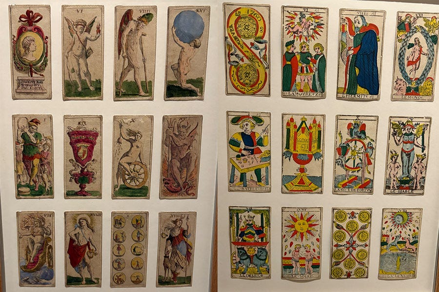 The Tarot Exhibit at the Warburg InstituteI met up with friends to visit the Warburg Institute’s exhibit on Tarot cards a week ago. I’ve linked to the press about it in a few past issues (e.g., Guardian). Aby Warburg collected books on magic and the occult, and began collecting Tarot decks in 1902 as well. Warburg’s strange Image Atlas project contained a large section on Tarot art. The current exhibit features many beautiful and important classic works (including Pamela Colman Smith, Austin Osman Spare, Jean-Baptiste Alliette or “Etteilla,” Frieda Harris and Aleister Crowley…); as well as some historical mysteries, like how these cards from decks dated between the 15th and 18th centuries ended up in the sewers and water tanks of Milan’s Castle Forza: Several very old decks were on display— on the right, a Tarot de Marseille deck (Nicolas Conver, c. 1860) and on the left, a rare Baroque style deck from Bologna, Tarocco Bolognese, by Mitelli (1634-1718), c. 1660, of which more below: