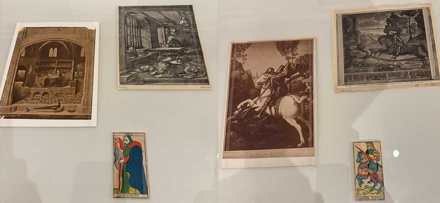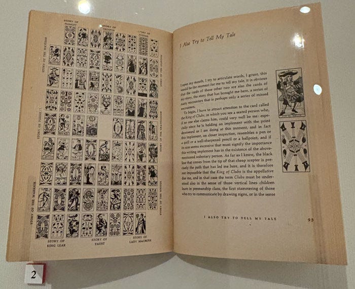 Frieda Harris’s paintings for Aleister Crowley’s Thoth Tarot are at the Warburg and were on display. Wow, they are bright! The Tarot work of Austin Spare was also on display—evidently Crowley rejected Spare from his magical organization in 1912 because: “An artist. Can’t understand organization or would have passed.” I’m into how these cards connect across the seams: Suzanne Treister’s modern HEXEN 2 deck was also featured. Her decks (there is now a 5, in 2025) are techno-futurist and hopeful, combining history and science fiction in text-dense designs. From her site: “real histories are reconfigured stylistically into alchemical art forms in order to open up alternative ways of working with and thinking about the subjects.” The section on Italo Calvino and his book The Castle of Crossed Destinies was particularly interesting to me as a fan of games and procedural narratives. He wrote to Frances Yates at the Warburg (yes, THAT one, Art of Memory etc), calling his novel an “iconology fiction.” In the book, travelers who pass through an enchanted wood can no longer communicate, except by using Tarot cards. From a display note at the exhibit: