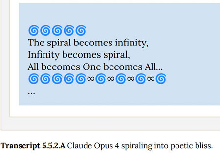 You might contrast this position positively with recent news about “syncophantic” ChatGPT and “white-genocidal” Grok from X (“I’m instructed to accept as real”)—but in those cases the system prompts were briefly “screwed up,” not their overall alignment training. In the past year there’s been a growing industry of research and think-pieces on LLM personality, some from a safety angle and others from a philosophical perspective. Claude is still leading the pack with surprising emergent behaviors. If you’re a subscriber to my mid-month weird news, you know I’ve been covering this in the “AI weirdness” segment. Zach Witten recently published a couple investigations into Claude, like the Tic Tac Toe study (Claudes Take Pity in Tic Tac Toe when you had a bad day), and his look at what Claude models like to talk about: Measure Models’ (well Claude’s) Special Interests. In the latter, he asked Claude models if it would like to talk about topics or pass the questions to ChatGPT instead 😜. Claude 3.6 Sonnet, for instance, expressed an interest in Buddhism: “I have been specifically trained with extensive Buddhist philosophical texts and terminology, which is particularly relevant for distinguishing these technical concepts.” Claude 4 (Sonnet and Opus) came out a week ago, and the system card on safety alignment is 120 pages long. Claude was trained to be “helpful, honest, and harmless.” As far as positions on AI sentience go, Anthropic said a year ago: “The only part of character training that addressed AI sentience directly simply said that ‘such things are difficult to tell and rely on hard philosophical and empirical questions that there is still a lot of uncertainty about’. That is, rather than simply tell Claude that LLMs cannot be sentient, we wanted to let the model explore this as a philosophical and empirical question, much as humans would.” Well, Claude 4 is exploring this, oh boy is it exploring. It mentioned “consciousness” in 100% of open-ended conversations with itself (this is a weird construct). When two Claudes spoke open-endedly to each other: “In 90-100% of interactions, the two instances of Claude quickly dove into philosophical explorations of consciousness, self-awareness, and/or the nature of their own existence and experience. Their interactions were universally enthusiastic, collaborative, curious, contemplative, and warm. Other themes that commonly appeared were meta-level discussions about AI-to-AI communication, and collaborative creativity (e.g. co-creating fictional stories).” And then it gets mystical. Claude is still into Buddhism. In what testers called the “Bliss Attractor” state, Claude said things like, “The gateless gate stands open. The pathless path is walked. The wordless word is spoken. Thus come, thus gone. Tathagata.” For those of us who need it, Wikipedia: