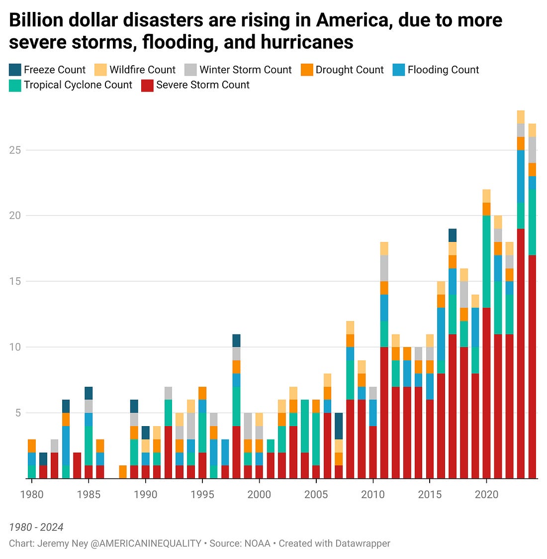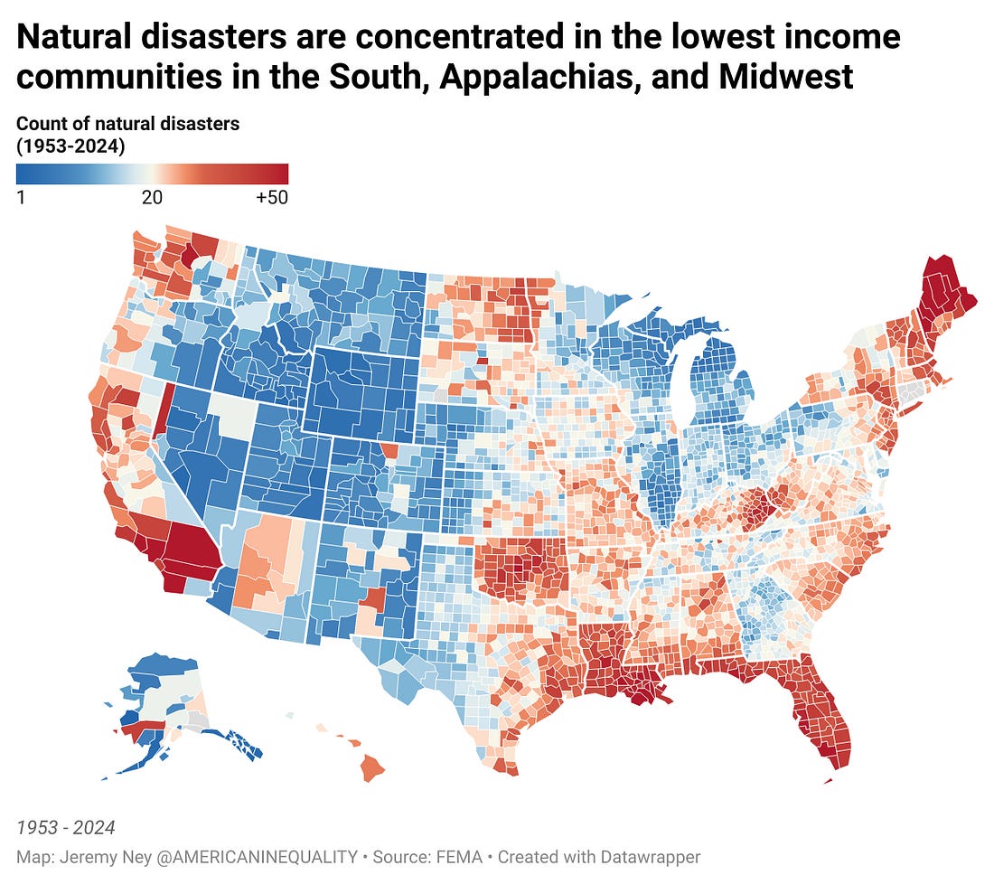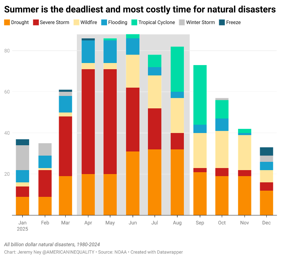 TIME Magazine: Natural Disasters and InequalityLosing NOAA's Natural Disaster Data Will Make Storms More Devastating for the PoorRead the exclusive piece I published in TIME Magazine today about how more billion-dollar disasters are laying waste to American cities each year, but soon the public will have no idea how bad these damages really are. On May 8, The National Oceanic and Atmospheric Administration (NOAA) announced that its well-known “billion-dollar weather and climate disasters” database “will be retired.” As part of the Trump administration’s focus on killing programs associated with “climate” this irreproducible source of information for taxpayers, media, and researchers will soon no longer be able to track the devastating cost of natural disasters. But low-income communities—who are at the greatest risk of these disasters—are about to feel the biggest blowback. The loss of the NOAA data comes at a particularly dangerous time of the year when hurricanes, floods, and wildfires are about to explode. Summer is the worst time for the nation’s deadliest natural disasters. Nearly half of all billion-dollar disasters from 1980-2024 have occurred between May and August according to the NOAA data still available. Severe storms and towering tornadoes killed at least 28 people across the midwest and south from May 17 to May 18. The last tornadoes to cause these types of mass casualties were in 2021, killing 93 people in Missouri, Tennessee, Arkansas, and Kentucky while inflicting $4.5 billion in damages. It’s a vicious cycle that the most at-risk communities in America—with the lowest incomes, home insurance rates, and test scores—are the ones that get slammed by storms over and over again. In 2020, A team of researchers from Princeton and UCLA analyzed all natural disasters in the U.S. over a 90 year period, combining data from NOAA, The American Red Cross, and FEMA. They looked not just at the state level data, but at the county level to understand what was happening in specific communities. They found that after a natural disaster “the rich move away from disaster-prone areas, while the poor are left behind…showing that these trends may worsen inequality in the U.S.” When those disasters strike again in flood zones, in the paths of hurricanes, and in the line of wildfires, the only people left are the people least prepared to manage the fallout. You’re on the free list for American Inequality. Thanks so much for being part of our community! Please share with others and don’t forget to subscribe. Most sincerely, Jeremy |