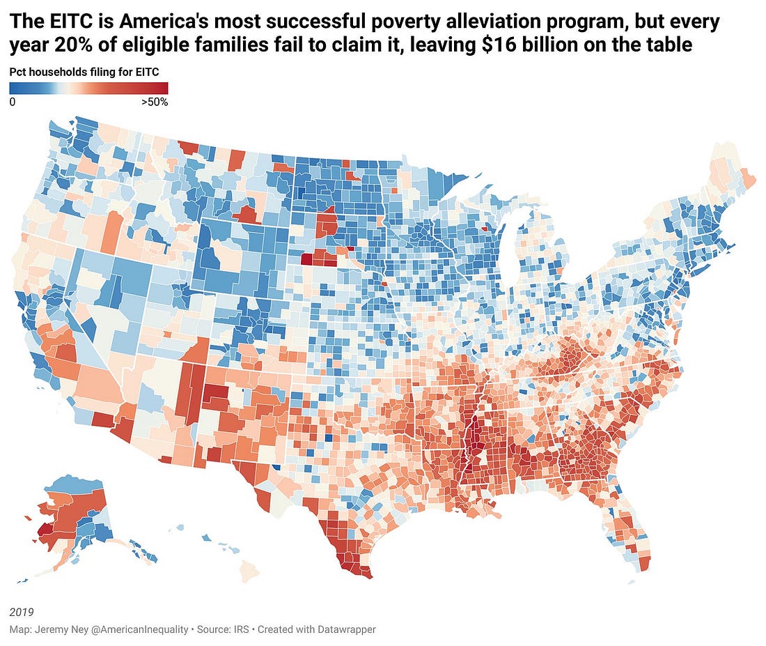 The Earned Income Tax Credit (EITC) and Child Tax Credit (CTC) are America's most successful poverty alleviation programs, but too few families actually claim this benefit. For millions of Americans, tax time is a source of incredible joy. I used to volunteer to help low-income families file their taxes in Boston and I remember people talking about tax season like “second Christmas” because they may get thousands of dollars in refunds through generous tax credits. This tax season though, the IRS reached an agreement to allow immigration officials at ICE to access confidential tax databases to confirm the names and addresses of people suspected of being in the country illegally. This led to the resignation of the acting IRS commissioner. The move from President Trump would dramatically decrease the number of people filing taxes, both decreasing government revenue and the share of people who might rise up out of poverty because of the EITC and CTC. As the Washington Post explained, “It would be unusual, if not unprecedented, for taxpayer privacy law exceptions to be used to justify cooperation with immigration enforcement.” Undocumented immigrants do file taxes, in large part because they earn income and because a provable history of paying taxes is seen as one way to show good faith and may someday help them become citizens. As one IRS official said, “This is a complete betrayal of 30 years of the government telling immigrants to file their taxes.” Undocumented immigrants paid nearly $97 billion in federal, state and local taxes in 2022, according to a July 2024 report by the Institute on Taxation and Economic Policy (ITEP), which used data on taxpayers with ITINs to estimate tax revenue. Initial estimates suggest that every 10-percentage point drop in the income tax compliance rate of undocumented immigrants would lower federal tax revenue by $8.6 billion per year, and state and local tax collections by $900 million per year. Last month, IRS leadership rejected a DHS request for the names, addresses, phone numbers and email addresses of 700,000 people the Trump administration suspected of being in the country illegally. Second ChristmasI remember working through finances with one mother who dumped every single piece of paper and receipt she had on the desk. Two children, single-income home, student debt, credit card debt. She made $43,000 as a nurse. Macy filed her taxes with TurboTax last year, felt like she was messing up the whole time, and got charged $100 at the end. The year before that, she filed her taxes over the phone using a company that an Instagram-influencer had recommended and paid $1,000 for it. This time, she decided to try something different. When we were almost ready to send her taxes off to the IRS and get her $4,000 refund, she asked if she could be the one to click submit. I pushed the keyboard over to her. We high-fived. While the chart above shows us where the most people in the US are filing for the EITC, it does not tell us where people should be filing. Imperial County, California has the lowest rate of people claiming the EITC who should be, largely because many immigrant families are afraid of how their information will be used. Imperial County is home to 150,000 residents, 84% are Hispanic and the median income is $44,000. In 2017, ICE Director Thomas Homan told a House appropriations subcommittee, “And by me saying you should be worried, you should be afraid. If you lie on your taxes, you got to be worried, and ask yourself, is the IRS going to audit me?” The IRS is not allowed to share any information with ICE, but Homan’s comments rippled through communities. 30% of eligible residents in Imperial don’t claim the EITC. The Best Poverty Alleviation Programs in AmericaThe EITC and CTC, which were both expanded in 2021, lifted 9.6 million people out of poverty. In 2022, together these programs lifted another 6.4 million people out of poverty. As the Tax Policy Center explains, “The EITC is the single most effective means tested federal antipoverty program for working-age households—providing additional income and boosting employment for low-income workers.” The policy has been around since 1975 and has been expanded by both Republicans and Democrats alike — Obama expanded the EITC after the 2008 financial crisis to support families hurt by the economic downturn, and Trump expanded it in 2016 to focus on helping low-income families with children and Biden expanded it again during the pandemic. However, the EITC remains highly underutilized. More than 20% of people who are eligible for the EITC fail to claim it. The average family will get $3,191 in EITC benefits, effectively boosting wages by $266 per month. When families fail to claim, billions of dollars are left on the table every year which just get recycled back into the Treasury. Aren’t taxes progressive?