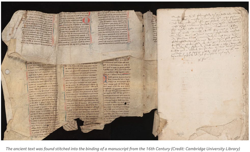 Let’s talk about Merlin and King Arthur! Despite #nokings! In 2019, a new fragment of Merlin manuscript was found in Cambridge and a 3 year process to digitize and interpret it ended this spring. Cambridge University reports the discovery occurred during a large-scale project to re-catalogue the library's estate records. An archivist noticed something unusual about the binding of a 16th-century register of property deeds for a manor in Suffolk. The cover was a folded, torn, and stitched piece of medieval parchment covered in Old French script. The item had been previously identified in catalogues as a 14th-century text about Sir Gawain, but was now re-identified as part of the Suite Vulgate du Merlin. It was dated between 1274 and 1315. There are about 40 known versions of this Suite, all slightly different. The Suite Vulgate du Merlin gives context on Arthur’s relationship to Merlin and the search for the Holy Grail and was foundational for Malory’s La Morte d’Arthur (on Gutenberg books here; and see some complex Arthurian text history at Wikipedia).