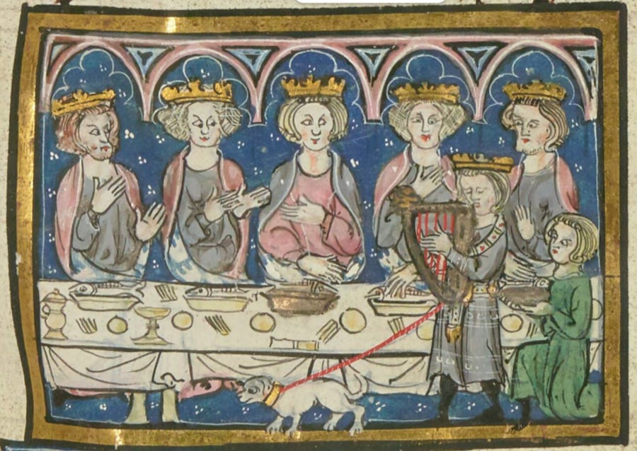 You can actually see and interact with a 3D model of the bound manuscript on Sketchfab! What a total mess it is. All angles and extrusions of the manuscript page were photographed with tiny angled mirrors, and it was then digitally “unfolded” to read it properly (there’s a video of that too here). In one of the stories in it, Merlin appears disguised as a harpist — shown in the pic here from a version of the manuscript in the BnF: Evidently Merlin the harpist was a hottie, via this translated bit (cite):