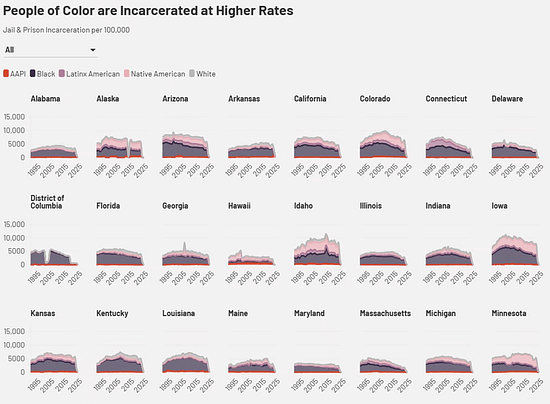 Land of the Free? Far from it.The Dividing Line's latest: Why the U.S. has the highest incarceration rate in the world.If all the people incarcerated in the United States lived in one city, it would be the 5th largest city in the nation. As of 2022, there are 1.8 million people incarcerated in the United States, or slightly larger than Phoenix, Arizona (1.6M). While mass incarceration is often justified as a strategy to improve public safety, its impact in many cases has been deeply harmful. Long prison sentences, limited rehabilitative services, and inefficient crime reporting systems show how mass incarceration often undermines its stated goal of reducing harm. These visuals are all interactive and available with more information at this link here. The increase in incarceration began in the late 1970s when the Nixon administration declared a ‘war on drugs’ and promised to be ‘tough on crime’. In 1980 the incarcerated population exploded, with a huge increase for the next 30 years. Mandatory minimums, three strike laws, and low-level drug offenses put far more behind bars than ever. Across the country, in all states, from large cities to small towns, incarceration grew. But even with these punitive measures, the violent crime rate also continued to increase. The US has a higher incarceration rate than El Salvador or Rwanda. Several countries experienced a similar increase in crime between 1972 and 1991, but very few expanded incarceration in the same way as the US. Even as crime rates fell between 1991 and 2009, incarceration continued to expand. Compared to other countries, the US has a significantly higher incarceration rate when controlling for the nation’s violent crime rate. The US has a higher incarceration rate than El Salvador or Rwanda. Even in places like Botswana or Ecuador that have far higher violent crime rates that are triple and quadruple what they are in America, their incarceration rates are one-third lower. Mississippi, Arkansas, and Louisiana have the highest incarceration rates in the United States. 17 states have a higher incarceration rate than any other country in the world. Black and Latino individuals are incarcerated more than 5 times the rate of people who are White. This reflects long standing issues of racial bias in our policies and policing. Punitive policies often involve targeting minority groups. While the US has a long history of incarcerating Black Americans, law enforcement agencies have recently turned their gaze onto immigrant communities. However, research shows that immigrants, many of whom are people of color, have a lower crime rate than native born Americans. Closing ThoughtsMass Incarceration has not been shown to improve public safety. Increasing punitive measures often deepens challenges faced by individuals and communities, while doing little to prevent future crime. Having more research-based policies with proven results and investments in rehabilitation is the only way we can move forward. While incarceration rates have been falling, the US is still struggling with a multi-decade long legacy of mass incarceration. Mike Wessler at the Prison Policy Initiative has the final word on America’s choice for the future: