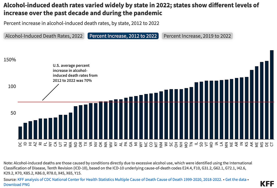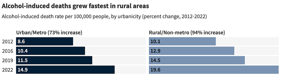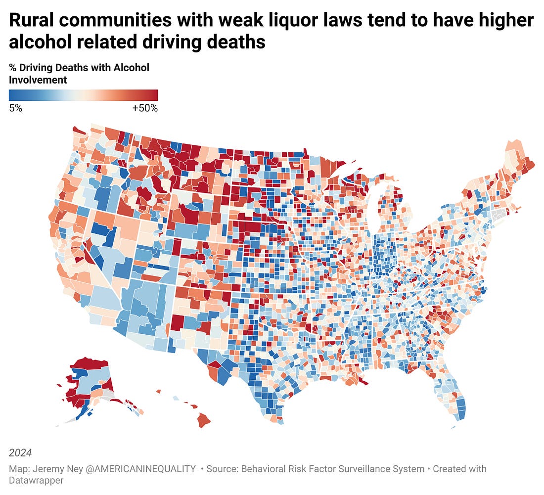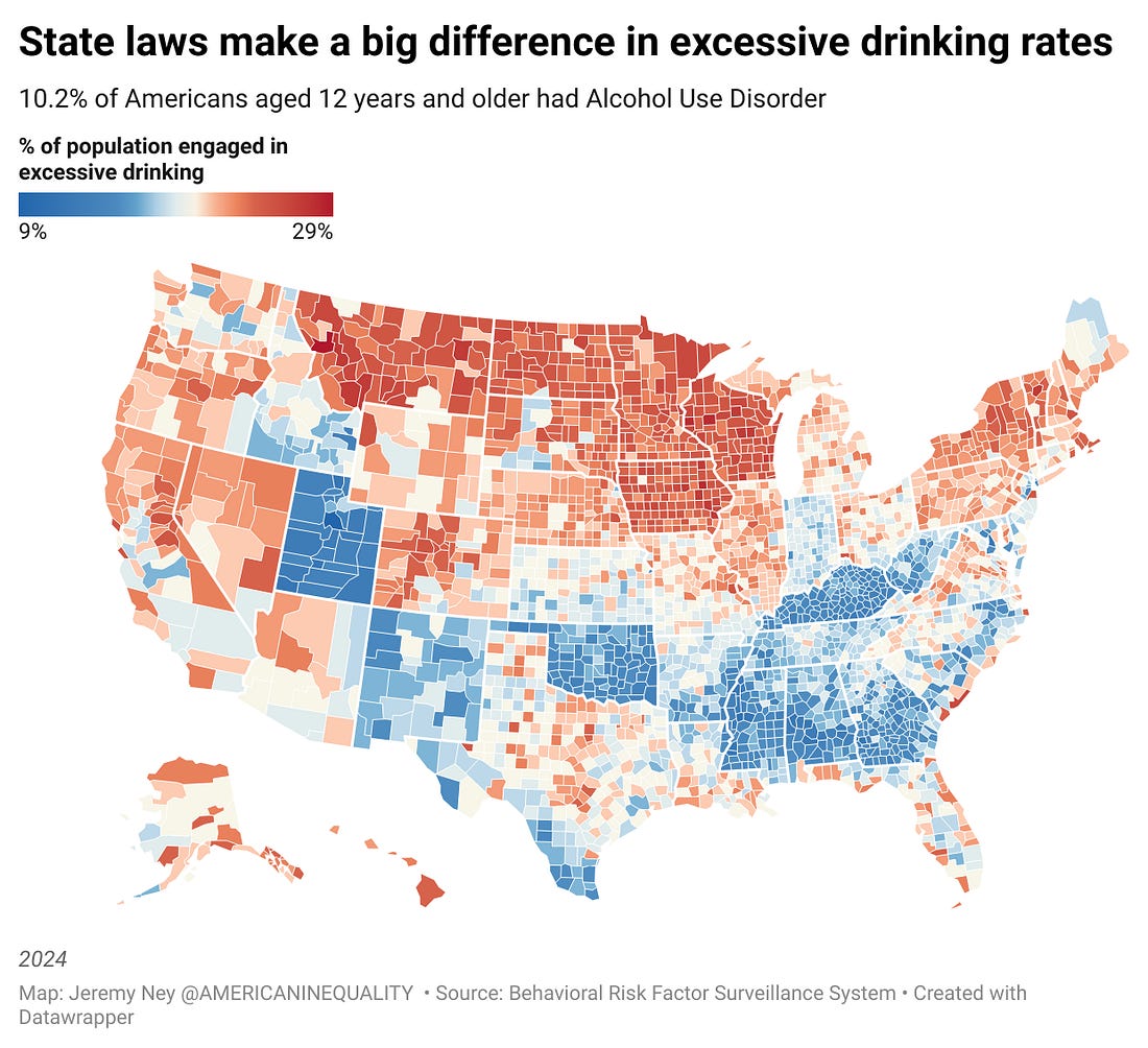 INTERESTING ON THE WEB Alcohol is one of the worst killers in America. Alcohol kills more people than opioids and suicides combined each year. Every 3 minutes, 1 person dies in America due to alcohol abuse, according to data from the CDC. By the time you finish this article, at least one person will be dead. Alcohol shortened the lives of those who died by an average of 24 years, leading to 4 million years of potential life lost. The number of alcohol-related deaths more than doubled among Americans between 1999 and 2020. On August 13, Gallup Poll released survey results reporting that only 54% of U.S. adults said they consumed alcohol, the lowest percentage in Gallup’s 90 years of collecting data on drinking behavior. Those who did drink alcohol said they were consuming less, the poll found. At the same time, I consistently hear this strong narrative that alcohol consumption is good because it also means higher socialization. “What’s wrong with young people today? They don’t get drunk any more,” declared one Guardian headline. “Champagne sales are down. Are parties dying too?” asked another WaPo piece. “We may have already hit peak booze,” wrote another Bloomberg article that praised a beloved tradition. There’s an adage that “Every drink takes five minutes off your life.” In January 2025, Derek Thompson wrote an Atlantic article that captured something a bit odd about this phrase. “Maybe the thought scares you. Personally, I find comfort in it,” Thompson wrote. For years Americans were fed a false idea that alcohol might be good for you. “There was this perception that a glass of red wine with dinner every night might actually help you live longer,” said Dr. Scott Hadland, the chief of adolescent and young adult medicine at Mass General for Children and an addiction specialist. In the 1990s, some doctors even encouraged moderate drinking. Consumption of alcohol is unequivocally dangerous for communities. Depending on where you are born, you may be far more likely to die from alcohol than in other parts of the U.S. Lax state liquor laws, lower enforcement of those laws, or higher rates of drunk driving – particularly in rural areas — may kill you at a much younger age. When it comes to different demographics, some communities are far more likely to suffer from the onslaughts of alcohol than others. STATE IMPACTS OF LAX LIQUOR LAWSInequalities in alcohol’s impact on communities is clear in the data. Stepping just a few feet across the state border from Lincoln County, Nevada to Washington County, Utah drops the excessive drinking rate by half, from 24% to 12%. Nevada has the weakest liquor laws of any state in the nation while Utah has some of the strongest. Las Vegas drives Nevada’s lax liquor laws, permitting people to buy liquor 24/7, to enshrine that public intoxication is not a crime, to ban “last calls” at bars, and to codify no state-level Alcoholic Beverage Control (ABC) law, meaning there are no state regulations on labeling, advertising, or retail outlets for alcohol. Utah, on the other hand, has a high mormon population and high altitudes which led to high restrictions on alcohol: You must order food if you’re ordering alcohol at a restaurant, all liquor bottles need a ‘metered-pour’ which control how much alcohol is dispensed from a bottle, beer at grocery stores can’t be more than 5% though this was recently 3.2%, and liquor can’t be purchased on Sundays. The death rate from alcohol in Nevada is twice as high as it is in Utah. Differences in saws aren’t the only thing that causes death rates to change — low enforcement of those laws also leads to unequal outcomes. Up until 2023, Wisconsin was one of only a handful of states that didn’t have a dedicated office charged with enforcement of alcohol laws. One official explained that alcohol enforcement in the state “went to hell” for decades as lobbyists helped wholesalers skirt many state laws, like shipping beers directly to consumers. Wisconsin is “locked in this weird death grip with alcohol,” said John Eich, director of the Wisconsin Office of Rural Health. “There’s a cultural level of acceptance of excessive drinking.” Wisconsin ranks the highest in the nation for excessive alcohol use which includes binge drinking, drinking while pregnant, heavy drinking and underage drinking. The powerful trade group the Tavern League of Wisconsin and the well-rehearsed phrase “Drink Wisconsibly” all reinforce this culture. Drinking deaths for Wisconsinites sites tripled from 6.7 to 18.5 per 100,000 from 1999 to 2020. States with lax liquor laws have far higher death rates from alcohol and more drunk driving incidents. While culture and enforcement of these laws are a factor too, inequality in outcomes persist depending on which side of a state border a person is born on. INEQUALITY FROM ALCOHOLInequality is rampant when it comes to how different communities experience alcohol: