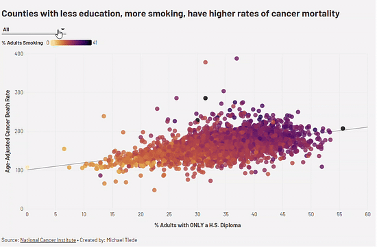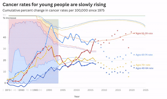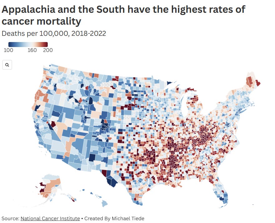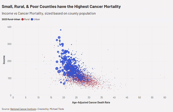 The Next Cancer Catastrophe is PoliticalCancer is on the rise for young people, but threats will soon skyrocketTrump is retreating in the war on cancer. He has cut nearly $1 billion in cancer research and although 40% of Americans will get a cancer diagnosis at some point in their lives, his administration has shown no commitment to fighting the deadly disease. In the mid-1970s, America’s five-year cancer survival rate sat at 49%; today, it is 68%. Every $326 that the government invests in cancer research extends a human life by one year. With such overwhelming threats underway, we wanted to revisit the inequalities of cancer for this next issue of The Dividing Line. Cancer is the 2nd leading cause of death in the United States. According to the American Cancer Society, approximately 611,720 people in 2024 died from cancer in the US. While cancer remains a leading cause of death, mortality has fallen by nearly a third since its peak in the 1990s as medical breakthroughs have given years back to people’s lives. But even with these improvements, there are still major factors that impact cancer mortality disproportionately across the country including income, education, healthcare access, and geography. Funding for cancer research is under attack, and these inequitable outcomes will become even more severe as cancer research sits with its largest momentum ever. These visuals are all interactive and available with more information at this link! The death rate from cancer has been declining steadily since the 1950s. While lung cancer is an outlier and peaked in the 1990s, at 44 deaths per every 100,000, it too has fallen 52% since that time. However, lung cancer still kills 21 people per 100,000 in large part due to high smoking rates in certain parts of the US and a healthcare system that cannot provide the necessary treatments. Even though national trends show improvement, not every region has benefited equally. The states with the worst rates of death from cancer are in Appalachia and the South. Mississippi (180 per 100k), Kentucky (179 per 100k), and West Virginia (178 per 100k) have the highest cancer deaths in the country (national average 146 per 100k), and lung cancer rates are around 50% higher than the national average. When examining why certain states are hit harder than others, lifestyle and education play a big role. Areas with the worst cancer mortality rates also have very high rates of smoking and lower levels of education attained. While the mechanisms driving this relationship are not clear, educational attainment is a well known factor in social determinants of health. Better education leads to healthier social environments with healthier lifestyles. Income also plays a major factor in the inequalities of care for patients. Generally those who are poorer and live in rural areas have higher rates of cancer deaths. Not being able to afford treatment and limited access to hospitals or clinics all impact the ability to help those who need care. According to OECD research, the US has fewer physicians relative to the population as a whole compared to other OECD nations, and these gaps in care are seen primarily in rural and poor communities. It’s true that wealthy people receive better care almost everywhere in the world, but the US has the largest extremes in healthcare outcomes of any developed nation. Certain types of cancer are more common depending on your age. Brain, blood/bone, and leukemia are the most common for children. Around the age of 20 other cancers start to increase including breast, colorectal, and cervical cancer. Lung cancer becomes the most common around 50 years old, along with breast, pancreatic and prostate/bladder cancer later in life. And while treatments have improved, the age distribution of new cases is shifting in concerning ways. Diagnoses in young adults 15-39 have risen 36.7% since 1975, almost double any other age group. While there is no clear reason for this increase, certain factors may include chronic inflammation, eating ultra-processed foods, medications taken during pregnancy, environmental chemicals, and increasing inequities in healthcare across the country. Certain cancers are more common also depending on the country you reside in. Australia for example, has the highest rates of skin cancer in the world. 2 out 3 Australians develop skin cancer due to individuals with light skin and high UV exposure. Closing thoughtsIn a country that has some of the best medical systems in the world, we should be doing better at taking care of the most vulnerable around us. Cancer compared to other diseases actually has better resources for early identification and treatment than other chronic diseases, but there are still major inequities in cancer outcomes. These visuals don’t necessarily highlight the issue of cancer treatment but rather the issue of social barriers to that treatment. We have the resources to save MORE lives than we already do, and can do that by investing in more affordable care, better education, and broader health resources to all communities. Ongoing political attacks on cancer research funding threaten to slow progress just when it’s needed most, undermining the possibility of breakthroughs and putting even more lives at risk. 5 Great Organizations to Connect with!