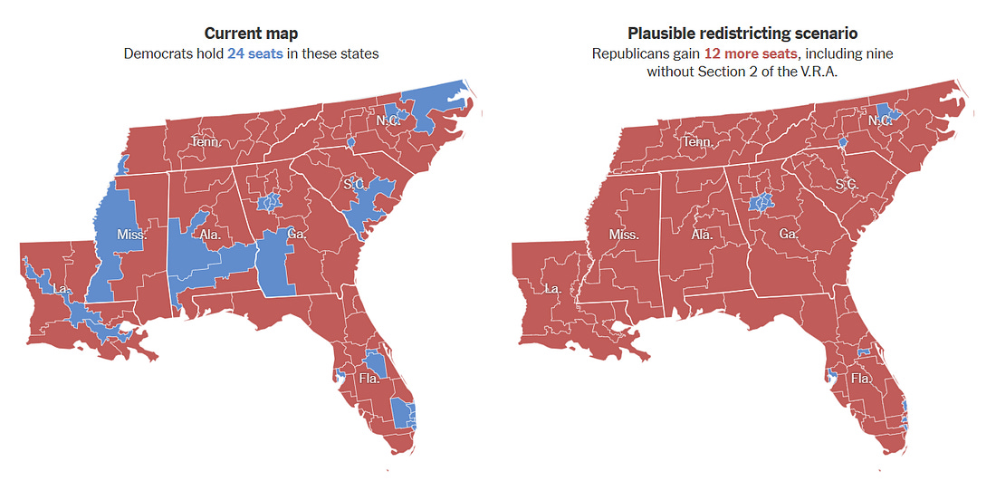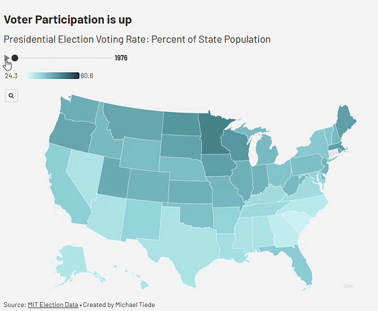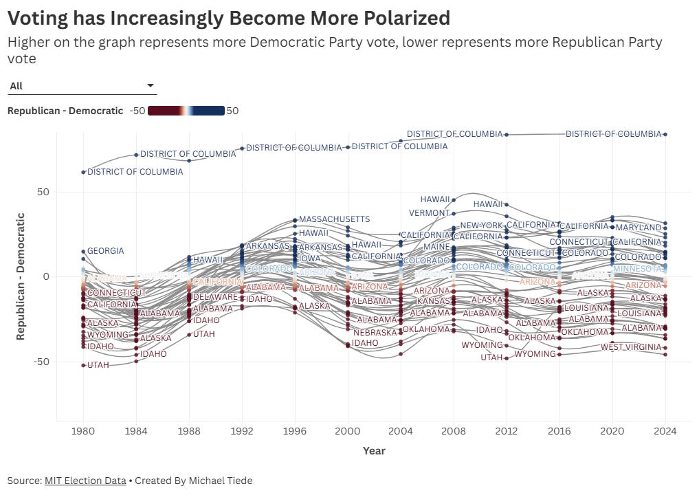 Let’s Make Every Vote CountAn analytical view on who gets to vote in America and what that means for our democracyWelcome to our 4th installment of The Dividing Line. Today, we’re digging into voting and inequality. With the midterms just 12 months away, we’re about to see a massive rise in efforts to both expand and suppress the vote. Inequality in voting is one of the greatest threats to our democracy. While some states are pushing to give citizens their full right to vote — like Connecticut, Colorado, and Virginia — it seems like far more is being done to cut eligible voters out of the process. As states pass different laws that inhibit Americans’ to vote, we lose the ability to reflect the needs of our communities. The Supreme Court is currently reviewing the Voting Rights Act of 1965, which bans discrimination based on race when creating electoral maps. The growing divide in voting access and political ideology along geographic lines isn’t just a policy issue—it undermines the fairness and legitimacy of our electoral system. More People Are Voting, So We’re Happy About ThatSince 1976, voting participation has increased across the US, but not in every state. Minnesota and Maine are the only states to have an average voting participation rate above 50%. Hawaii (32.4%) Texas (32.7) and Nevada (34.5%) have the lowest average voting rates. Though Voter’s Views within States are Becoming More PolarizedWhen examining voting trends by state over time, there is a distinct trend towards the extremes. In 1980 (Carter vs Reagan) states had a relatively similar voting margin (i.e. most states were 60/40). Compare that to more recent years and states have pulled further apart—red states are getting redder, and blue states bluer (i.e. more states are now 70/30). For example Iowa — historically known as a swing state, has increasingly become more Republican – voting red the last 3 elections. Independent voters turned Republican as they felt the pain from deindustrialization that they blamed on Democrats. Gun laws and cultural messaging also seemed to resonate more with Iowa voters. But perhaps most importantly, The number of Republican registered voters has steadily grown in Iowa in the past 12 years while the number of Democrats has shrunk. California— known for its liberal policies, has an increasing percent of Democratic voters every year up until the 2024 election. This issue also highlights problems with the Electoral College—when fewer electorally pivotal, or “battleground,” states remain, a smaller portion of the U.S. population ends up having a disproportionate impact on the election outcome. The Voting Rights Act is Under AttackThe Supreme Court seems prepared to strip a key provision of the Voting Rights Act, which banned discrimination based on race when creating electoral maps. Removing this provision would erase steps given to help minority voters choose a candidate of their choice, and expand electoral diversity and opinion. This comes at a time of electoral confusion, with Texas gerrymandering mid-cycle, and California responding with its own remapping with Prop 50. The Voting Rights Act has been a key limitation on gerrymandering, particularly in the South, as it bans voting practices that racially discriminate. The map below illustrates what could happen without Section 2 of the Voting Rights Act. At the End of the Day, it is Unclear How Well the System WorksDespite this polarization, our political system is still dominated by a two party system. Since 1976, only a few third-party candidates have received a meaningful share of the vote. How would our political ideologies shift if there was a strong third option to choose from? Would polarization decrease if people had more choices?