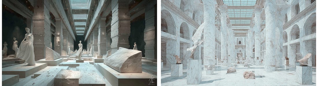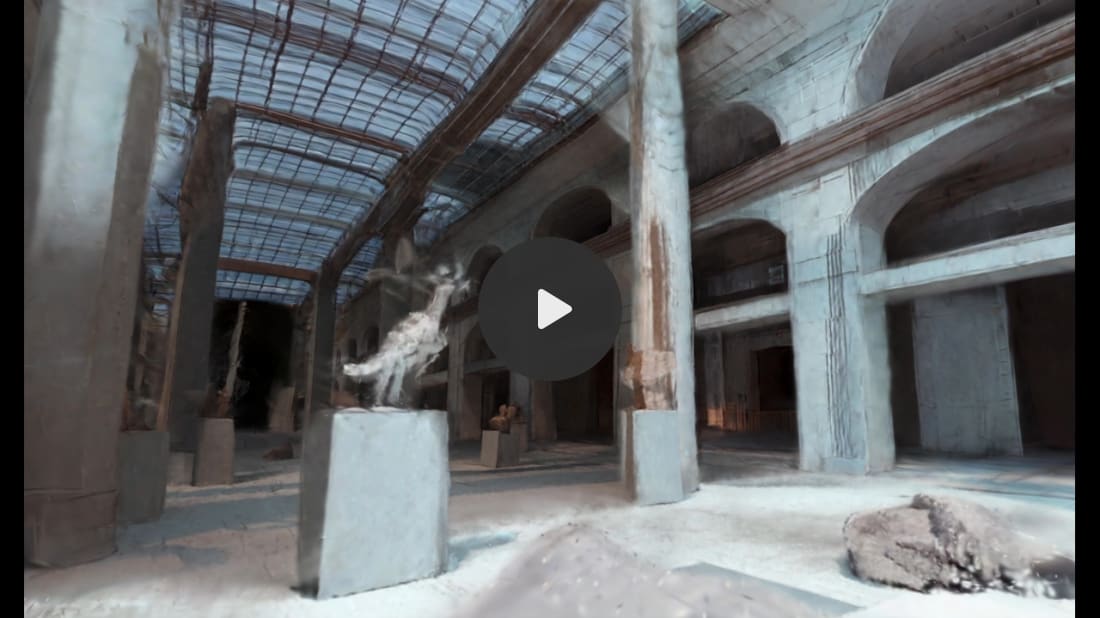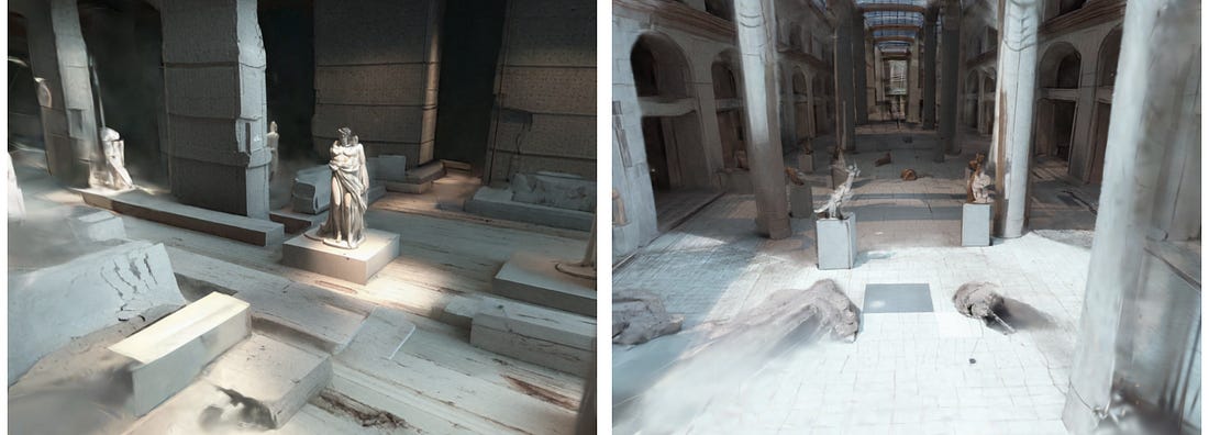 But onto my experiment: For exploration purposes, I made 2 worlds from images generated in Midjourney for a Piranesi-like museum/gallery of strangeness (the Susanna Clarke Piranesi). The boundaries on the splat worlds don’t go far, but I remain interested in the visual decay as the details fade. I think it’s entrancing. Some views in my browser: Using the SuperSplat editor, I cleaned their limits up on the ends (and a little bit inside but not much) and oriented them end to end: While in there messing around, I finally figured out how to make and export an animation of moving end-to-end (I kept the blurry junction of the 2 because I liked it, while most people are editing thing together seamlessly): And then with the help of some audio generated in Suno v5 and some AI coding tools, I made a little web app that has the camera circle in one splat, transition to the next with a glitch audio effect, and then circle in that one. Positions and views are randomized slightly each transition. Each splat has its own audio file and there is a drop off/mix as you move between them. Tiny video snippet of running it once: This was fun, and made me think hard about ways to use these things even in the limited form they have now, how they could be easier to work with, and how audio might work inside them. I also ended up wanting some different things from Suno v5 that I couldn’t figure out how to generate, like whispers and chanted nonsense, and more sound fx mixed in with the audio (wind, rain)… I could spend time editing that myself, but, geez, time! More coming, I hope! Tools of relevance, some of which are new and some of which I’ve mentioned in the past, but used over the weekend: