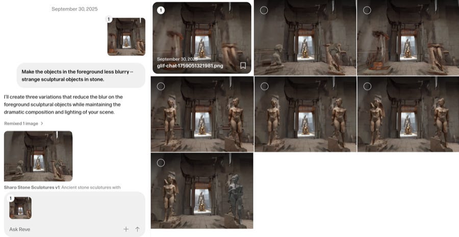 One other quick item worth noting under deadline: AlmondGod/tinyworlds: minimal reimplementation of deepmind’s genie 3 world model, a small, artisanal version of Google’s unreleased Genie 3. Cute. Maybe it belongs in Games though. Image GenerationReve Image - AI Image Generator and Creative Tool - Christian Cantrell’s image editing/generation app in its latest form. You can have conversational editing threads, and it has a proto-editor tool that allows you to select objects in images and modify them by editing their prompts. You can also just generate by prompt, like these 3 from my attempt at “polaroids with questionable garden fairies”: Here’s a view of me iterating on cleaning up some blurry statues in the foreground (1, top left), and adjusting their design: VideoA good piece in the latest on “how it really goes trying to make pro work product with AI gen tools” — Tool: Land Rover Defender – “Who Says Cars Can’t Dream” Experimental Spot (via Matt Muir’s Web Curios). The Kling 2.5 Turbo is really good. You can try a glif app to make a long video with it if you want (my effort was only so-so and then Kling had an API problem, but Fabian’s examples on their site are great). Also out: wan-2.5-i2v on Replicate and Fal. And this morning was Sora 2… well, not super accessible from the EU, but there are means (thanks to TomLikesRobots for an invite). I tried to make a bunch of Fat Cat Week videos (all text to video except for the last Midjourney one), for “fat cats play in a pool under a waterfall, catching salmon and tossing them in the air” and before I knew it I had done it with a bunch of models. See what you think about their grasp of physics, fatness of the cats, etc. Web Fun / Procgen / Misc ArtyThe three.js account on X posts a ton of gems, if you are into 3d web stuff (obvi I am). Air Fiesta FM (Beta 2.2.59): A Google-Earth based 3d web game with balloons. I love this. You fly around over your map of choice (my new town, for instance) and navigate towards pins floating in the air, to open up controls and ability to stream local radio. (Via Three.js or Garrett Johnson, or both.) Another cute three.js web mini game - Messenger. Deliver letters in a small world. There may be quite a lag… some characters had a “…” over their head for quite a while. Maybe because it’s multiplayer (you run into yourself a lot). Josh Comeau’s Whimsical Animations course is opening up with some preview content. Lofiworlds.ai — as noted above, a little idle app that shows off lightly animated cozy World Labs splat worlds. In VR it’s amazing — every world is a story waiting to be told. You can watch them without VR but you won’t be as impressed, and you won’t feel like you’re in a moving painting. Speaking of moving paintings, friends and colleagues of mine worked on this Google Arts & Culture animated paintings project with Veo, which is lovely: Moving paintings × Fukuda Art Museum — Google Arts & Culture. Another superb historical recreation from Nicolas Rougeux: Printing Types, their History, Form and Function. GamesCanvas of Kings on Steam: Amazing map maker tool, I will make maps with this. #47 | We asked for chaos. You delivered 480 times. Indie game jam produced entertaining ideas. I built ChatGPT with Minecraft redstone! - YouTube: Building an actual LLM in Minecraft blocks. I continue to be blown away by the Minecraft craft culture. Also, today’s Dreamer 4 paper from Deepmind— “By learning behaviors in imagination, Dreamer 4 is the first agent to obtain diamonds in Minecraft purely from offline data, without environment interaction. The task requires choosing sequences of over 20,000 mouse and keyboard actions from raw pixels.” Among AIs — “A live arena where top AI models play Among Us against each other.” God I love this. Done before the new Claude was born, GPT-5 is an outlying winner. “GPT-5 combines high accuracy with low harm, the safest town player.” I’m honestly a bit surprised. “GPT-5 remains proactive and leads harmful ejections; good at deception.” That, otoh, doesn’t surprise. I loled at the title on this example: Roguelike Celebration - Event 2025: Online fun talks about games, procgen, narrative — tickets for sale now, program announced. Doors in games, a game about doors — via Federico Pianzola. So cute, after my mid-month AI door exploration 2 weeks ago. They also have a bunch interesting other meta-games and think-piece games, plus articles, which all sound very intriguing to me.