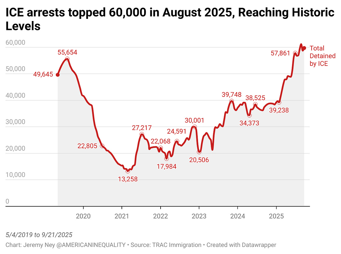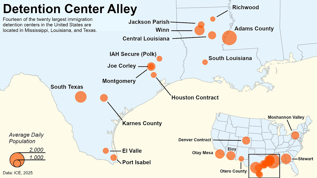 Over the past five years, ICE has detained hundreds of thousands of people across America—creating an unbearable weight for immigration courts to navigate. For this article, I dug into half a million detention records to uncover where the system is buckling. I identify why courts are drowning under the heaviest backlogs in history, where communities are crammed into the most overcrowded facilities, and which detention centers are profiting from this American calamity. On October 3rd, the government announced a plan to offer $2,500 to migrant children as young as 14 if they forego their court dates and voluntarily leave the country. Southern States have Highest Numbers of ICE DetaineesICE has detained 60,000 people in America today. 71.5% of current detainees have no criminal convictions. Texas and Louisiana have the highest number of ICE detainees - accounting for 1/3rd of the total detention population. Part of the reason these Republican-dominated states have such higher arrest numbers — particularly when measured against population — is they have a longer history of working directly with ICE, and a stronger interest in collaboration. They want to be seen as working closely with the Trump administration. Even in June when masked federal immigration agents swept through Los Angeles, California saw 3,391 undocumented immigrants arrested, only about half as many as Texas.