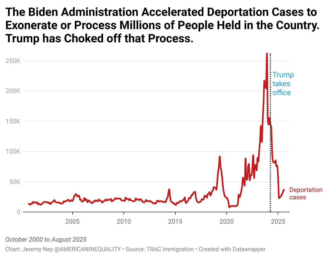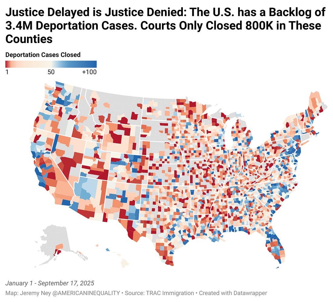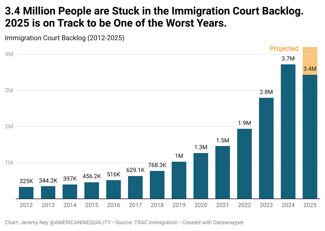 At the end of August 2025, 3,432,519 active cases were pending before U.S. immigration courts, a 3x increase from 2019. Of that 3.4M backlog, 2.3M immigrants have already filed formal asylum applications and are now waiting for asylum hearings or decisions in Immigration Court. If the current administration, however, is holding cases - those filed applications will go unanswered for years potentially. Deportation cases fell from a high of 262,178 in December 2023, the month before President Trump took office, to 30,501 just a year and a half later. The Trump administration is keeping hundreds of thousands of people stuck without court dates or due process, effectively trapping them in the criminal justice system. Miami-Dade County, FL, has the most residents with pending Immigration Court deportation cases at 146,293. ICE is Not Focused on Criminals, Just Creating FearOne of the most striking data points to emerge from this entire research was that ICE is not targeting criminals or violent offenders in their raids. According to the hundreds of thousands of court records I reviewed, only 1.59% of 2025 new cases sought deportation orders based on any alleged criminal activity of the immigrant, apart from possible illegal entry. Interviews with families revealed a sense of bewilderment about why ICE decided to arrest their father or mother. There was no criminal history, they had consistently shown up to court dates and were working respectable jobs and paying taxes. The almost randomness of the attacks has been paralyzing. But the goal is not only to arrest and deport criminals - it also to incite fear. We know that ICE is using court dates to arrest immigrants the moment right after they walk out of the courtroom. Families plead their case in front of a judge that they need asylum from the terrors and injustices they experience in Honduras, Guatemala, and El Salvador, only to be snatched up by ICE officers waiting outside the door for them when their case is quickly dismissed or rescheduled for years in the future (a common feature in a backlogged system). Then they are trapped in a new lawsuit battle over a civil immigration violation, which is based on federal immigration law, not criminal code. These charges can include being in the U.S. without legal status. Carlos Javier Lopez Benitez is a 27-year-old immigrant from Paraguay who felt all of these injustices over the last 3 months. On July 26, he showed up for his New York City court date seeking asylum, only to have his hearing rescheduled for 2029. Carlos had crossed the southern US border in May 2023 escaping his country and was apprehended by border patrol in Arizona. He was placed in deportation proceedings and released into the United States as his case wound through the courts. He traveled to New York, where he reunited with his two sisters, who are U.S. citizens. He lived in Queens, worked in construction and did not have a criminal record, according to his family and his lawyers. Mr. Lopez Benitez showed up regularly for court dates, but on that July date, ICE was waiting for him outside. They arrested him on grounds that he was in the country illegally and they transferred him 1,600 miles away to a detention center in Houston. 2 weeks after his detention, he was transferred back to New York City and released while his deportation case proceeded. The Path ForwardICE is weaponizing the courts. To stop this current administration from using the justice system as a tool of control instead of a force for righteousness, here are a few things public, private, and non-profit organizations can focus on.