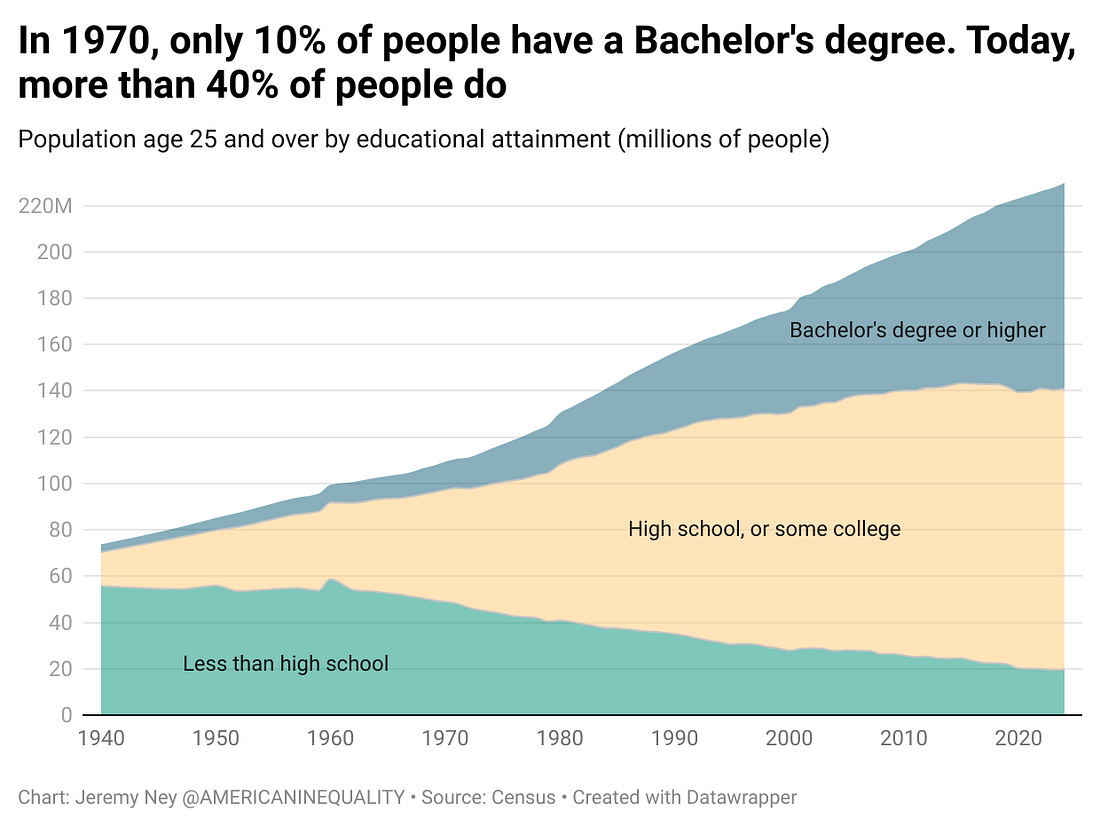 College AttendanceOne of the biggest improvements since the 1970s has been college attendance, largely as more women began applying to college and more colleges began accepting women. Today ~40% of young adults have a bachelor’s degree, compared to ~10% in 1970. As I’ve previously covered in my article about male loneliness, women weren’t allowed into Yale until 1969, Brown until 1971, and Columbia until 1983. Colleges were not interested in accepting women for decades, but many of the social movements of the 1960s changed that persona, as well as the codification of Title IX. In 1970, 33.6% of women had less than a high school education. By 2016, it had fallen to just 6%. People who go to college earn what is called ‘the college wage premium’ which means that they earn far more later in life. One government report says that men will make $900,000 more when they get a BA vs. only a high school degree and another gov report says that a BA can increase weekly median wages by 66%. At the same time, only half of all Americans say that college is only worth it now if you can go without taking out loans. With $200,000 in debt and a possible lifetime of interest on that loan, those higher wages may feel too far off for some people. Quality of LifeIn the Stossel debate, Norbert Michel explained, “Materially, we are so much better off now than we were in the 1960s and 1970s.” The median home size in 1963 was 1,365 feet but in 2023 the median is 2,286 feet. They are twice as likely to have central air, twice as likely to have a second refrigerator, and the abundance of dishwashers, washer dryers, and a range of other household appliances has made those homes much more comfortable. Those benefits have also created greater gains for women who disproportionately had many household duties fall on them. While it may feel like the price of groceries has exploded in 1960, U.S. consumers spent an average of 17.0 percent of disposable personal income (DPI) on food. By 2019, this share had shrunk to 9.5 percent. People eat out at restaurants almost twice as often as they did in 1970 and they have the luxury of ordering food to their house more easily. Path ForwardThe Path Forward for this is pretty simple to describe, but challenging to achieve: Keep up the momentum. Our gains on climate, life expectancy, college, and quality of life feel like they are seeing cracks that we need to make sure stay closed. A new report found that climate change kills 1 person every minute globally. Measles was eliminated from the US in 2000 and is now seeing some of its highest levels in decades. 45 million Americans have $1.6 trillion in student debt. Women who have lost their right to choose and immigrants who feel threatened daily may not feel like their quality of life has improved, despite having a smartphone in their pockets. We still have a long way to go, and the further back we look, the better things might be (2025 is lightyears better than 1925) but today in America, the answer to the debate for me is clear: opportunity is out of reach. You’re on the free list for American Inequality. Consider upgrading to support this work, get access to the community chat, and doing your part to reduce inequality in America. Most sincerely, Jeremy |