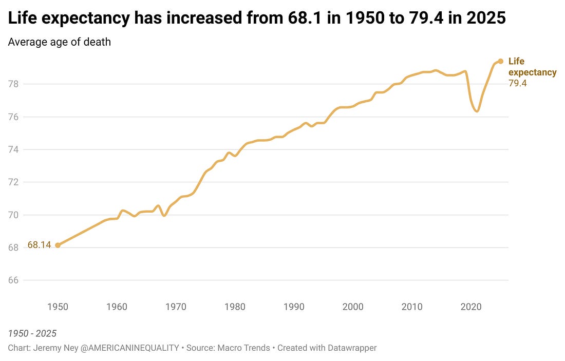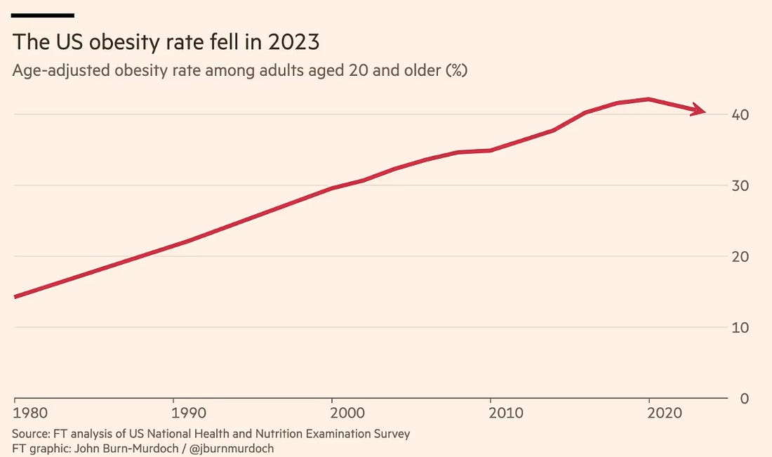 Life expectancyThe very first article I wrote for the American Inequality Substack was about the 20 year gap in life expectancies across regions in the nation, and while anyone who knows my writing knows that I despise a national narrative because it masks what is happening in communities, it is still acknowledging that nearly every region has experienced huge gains in life expectancy since the 1970s. Life expectancy has increased by almost a year and a half for every decade since 1970 (which makes you wonder, by 2070 at this rate we will only be living to ~89 on average). But there have been tremendous gains in healthcare improvements. Although healthcare costs continue to be overwhelmingly painful for Americans (and we see horrible return-on-investment for the amount we spend on healthcare without getting the corresponding improvements in health), heart disease death rates have fallen by half, stroke death rates have fallen by more than half, it turns out that the COVID19 vaccine doubled the cancer survival time of patients in a completely unexpected and amazing twist. Many are also estimating that thanks to GLP1s like Ozempic and Wegovy, the US obesity rate is now falling for the first time ever (or at least since we started tracking it in 1980 🙂. As John Burn-Murdoch points out, “What makes this all the more remarkable is the contrast in mechanisms behind the respective declines in smoking and obesity. The former was eventually achieved through decades of campaigning, public health warnings, tax incentives and bans. With obesity, a single pharmaceutical innovation has done what those same methods have repeatedly failed to do.”