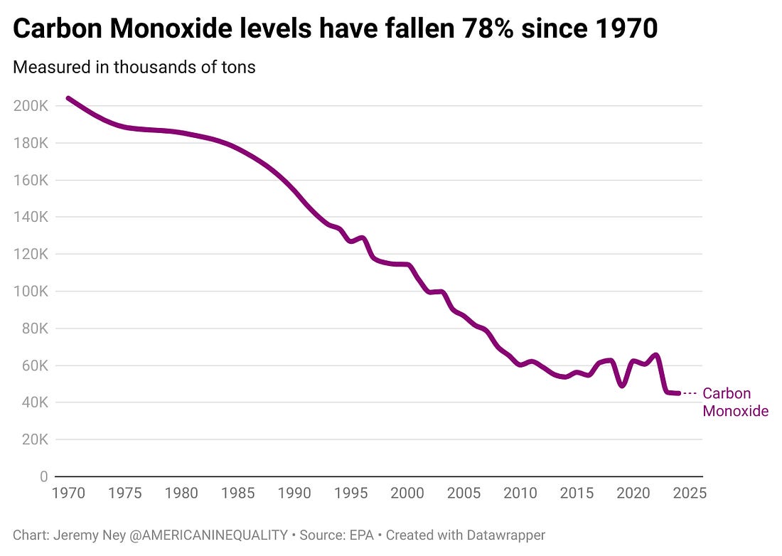 And while I didn’t include it in our conversation back then, millions of Americans (many of whom are children) are going hungry as the government plays poker with their food support, and millions more still have seen their healthcare premium payments double. The current pain is very real. But in my research I also prepped the other side of the argument. I wanted to know all the data on the ways the world had gotten better and why we should also be both hopeful about the state of the world today. There is a lot of darkness around us, and there is no doubt that we are living in an age of tremendous inequality. For half of the people in the US it feels like the American Dream is impossible to achieve. But the reason that the conversation was set up as a debate is because there have been incredible improvements in America. While my focus tends to be on the current state of the world - with a particular lens on regional divides - the historical perspective going back to the 1970s shows that we have in fact seen some tremendous gains along certain measures. America isn’t perfect, but I hope there’s a bit of brightness in here for everyone. Environmental improvementsEnvironmental quality has improved tremendously thanks to the Clean Air Act — air pollution is down by 70% since 1970. Carbon monoxide levels have fallen 78%, largely due to cars and trucks making 10x improvements in pollution emotions. Even as the U.S. population has grown by 130 million people since 1970 - requiring more homes, cars, streets, and plane travel - our per capita CO2 emissions have fallen by 35.6%. In 1970, the US was producing 29 out of every 100 tons of CO2 pumped into their environment. Today, it is just 13 (largely as the US has swapped spots with China as being the world’s leading polluter). Particulate matter 2.5 (the most important measure of pollution that tracks large particles which can get stuck in your lungs and deteriorate your health) has fallen 32.6% since 1990. Chlorofluorocarbons, a chemical often referred to as ‘the O-zone killer’, have nearly disappeared from most manufacturing processes.
