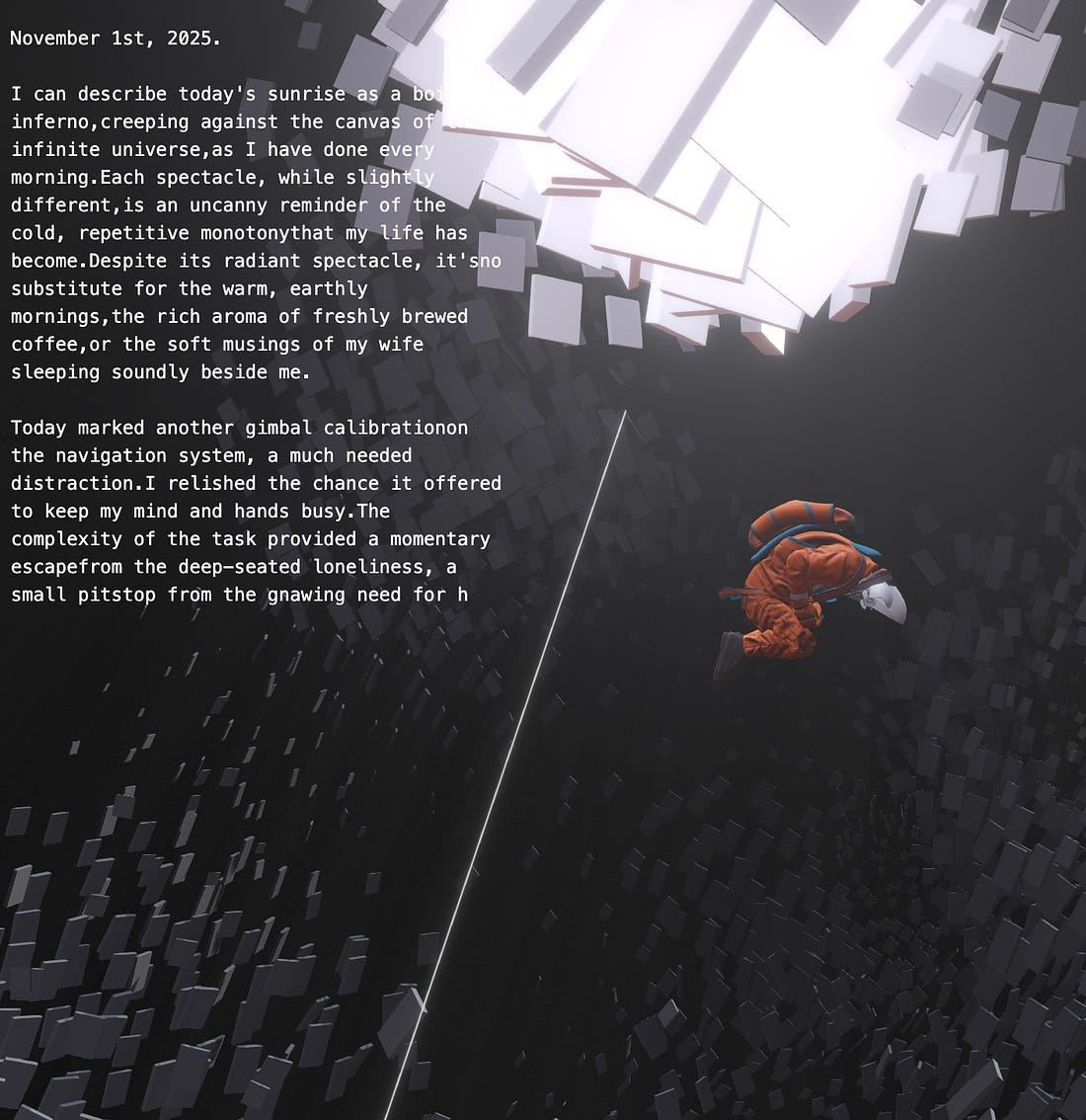 GeoSpot Infinity — trained on Google streetview, it tries to guess the location of images you upload to it. I have a shit-ton of random French walking and travel photos, and it didn’t find mine. But I was interesting watching it struggle. Drift — an AI shader experiment, with an astronaut drifting lost in space, and a lot of weird square particles around him. An AI call gets a diary entry for the day. (Via three.js) Games LinksInkwell — SiliconJungle on X is working on a 2d game engine with AI generation tools, which immediately solved one of my regular image gen test problems: generating walking sprites for a character. It’s an invite Discord/app situation, but really fun to play with. I am working on a gardening game based on the medieval garden I volunteer in, except with Victorian women instead of retired French ladies. You have to clean up the leaves in the fall, and their are herbs to pick and plant. It would be awesome to vary it by real-time season. IFComp 2025: Interactive Fiction (i.e., CYOA text games) winners. Strangely the first place “This work also won 3rd place in the 2025 Miss Congeniality Awards.” What does this mean about it. I haven’t had a moment to even look at these. SPINE by Backwards Tabletop: “A solo ttrpg about losing yourself in a book” via Florence Smith Nicholls. Also see Sending, a Keepsake game, from Florence.
