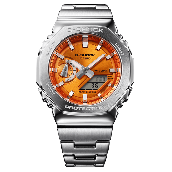 | | 2110D Series | | GM-2110D-4AER | | Presenting the latest addition to the renowned 2100 line, now with an octagonal stainless-steel bezel, metal band and a vibrant orange metallic dial. | |